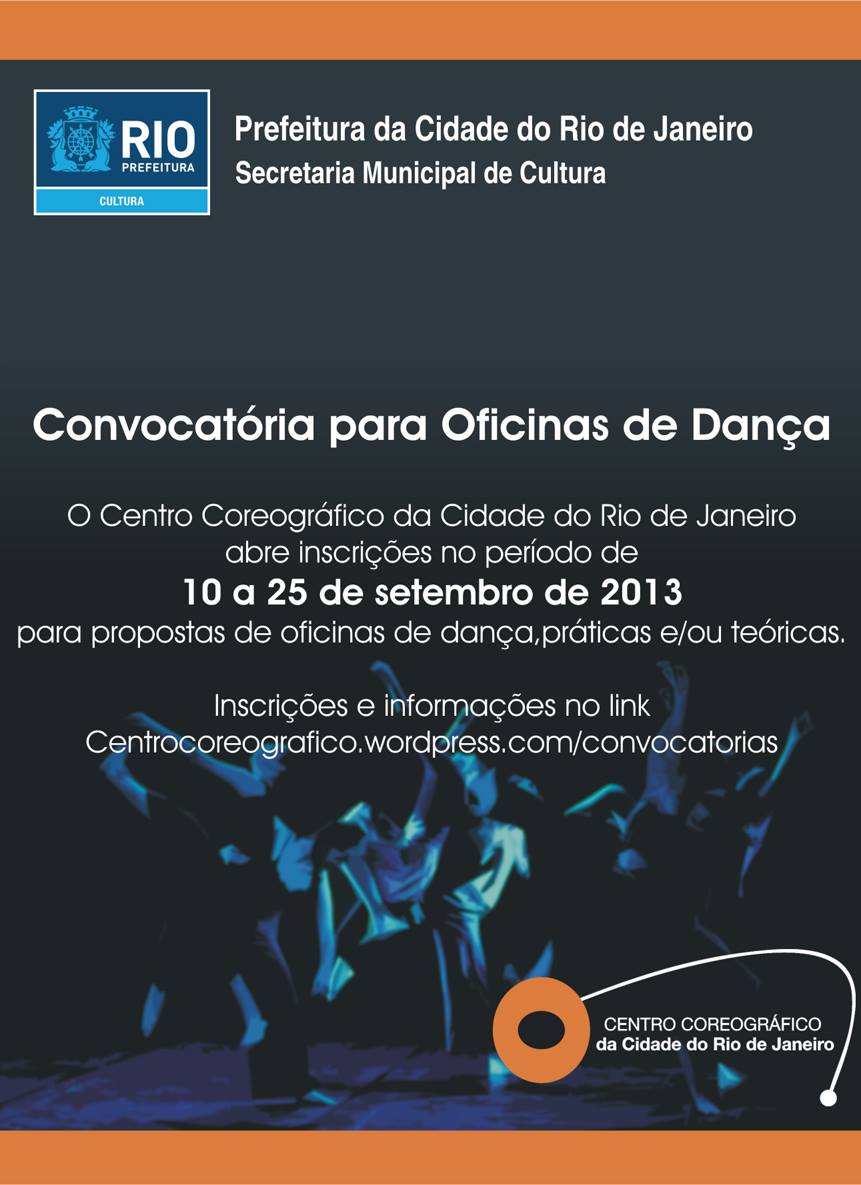 Entre os dias 10 e 25 de setembro, o Centro Coreográfico da Cidade do Rio de Janeiro receberá inscrições de propostas de oficinas de dança, práticas e teóricas, a serem realizadas no Centro Coreográfico da Cidade do Rio de Janeiro, entre o período de 15 de outubro de 2013 a 01 de fevereiro de 2014, cujos conteúdos sejam direcionados à formação e capacitação na área da dança, atendendo o público geral ou o público específico de estudantes e profissionais da área.Serão selecionadas 6 (seis) oficinas dentro do formato dos programas Aos Sábados Danço e Aperfeiçoamento Profissional, tendo a carga horária total de 24h, em 16 aulas.