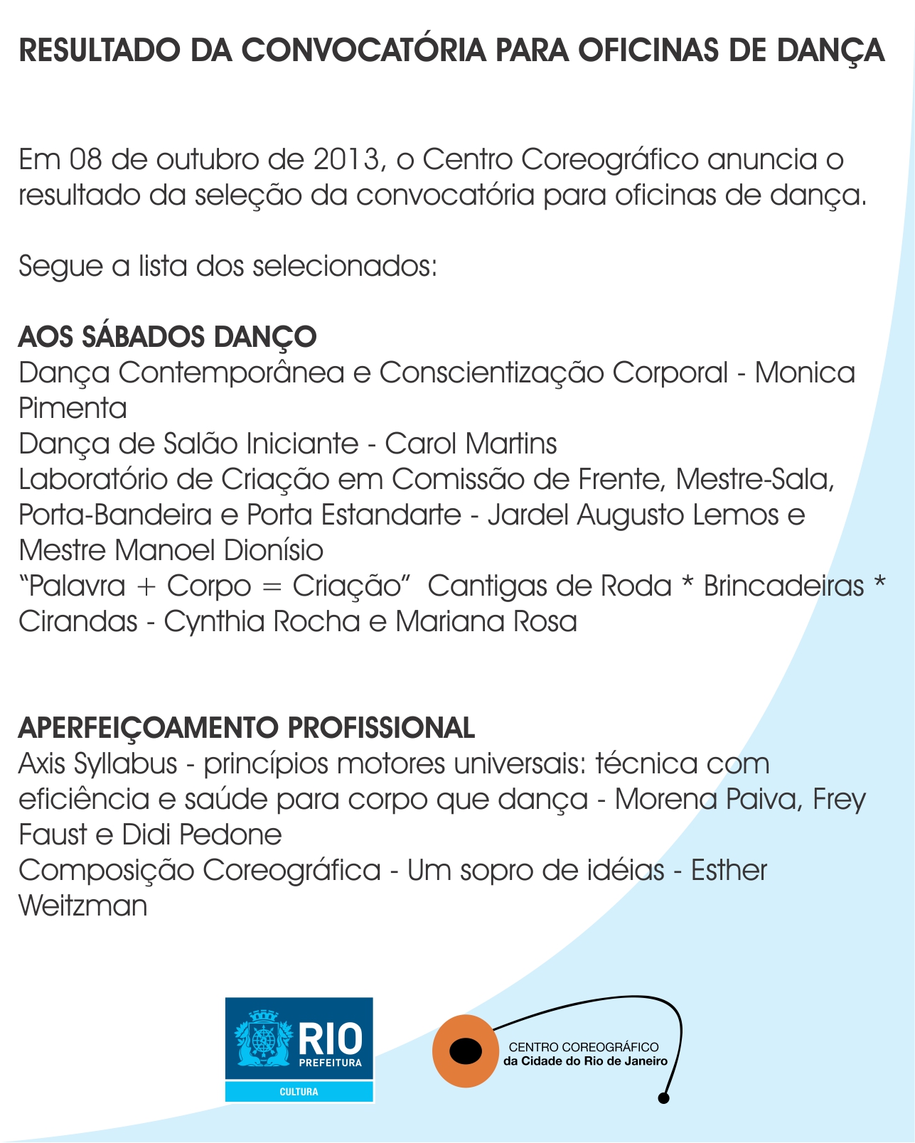 CONVOCATÓRIA – OFICINAS DE DANÇA NO CENTRO COREOGRÁFICO DA CIDADE DO RIO DE JANEIRO OUTUBRO.2013 / JANEIRO.2014