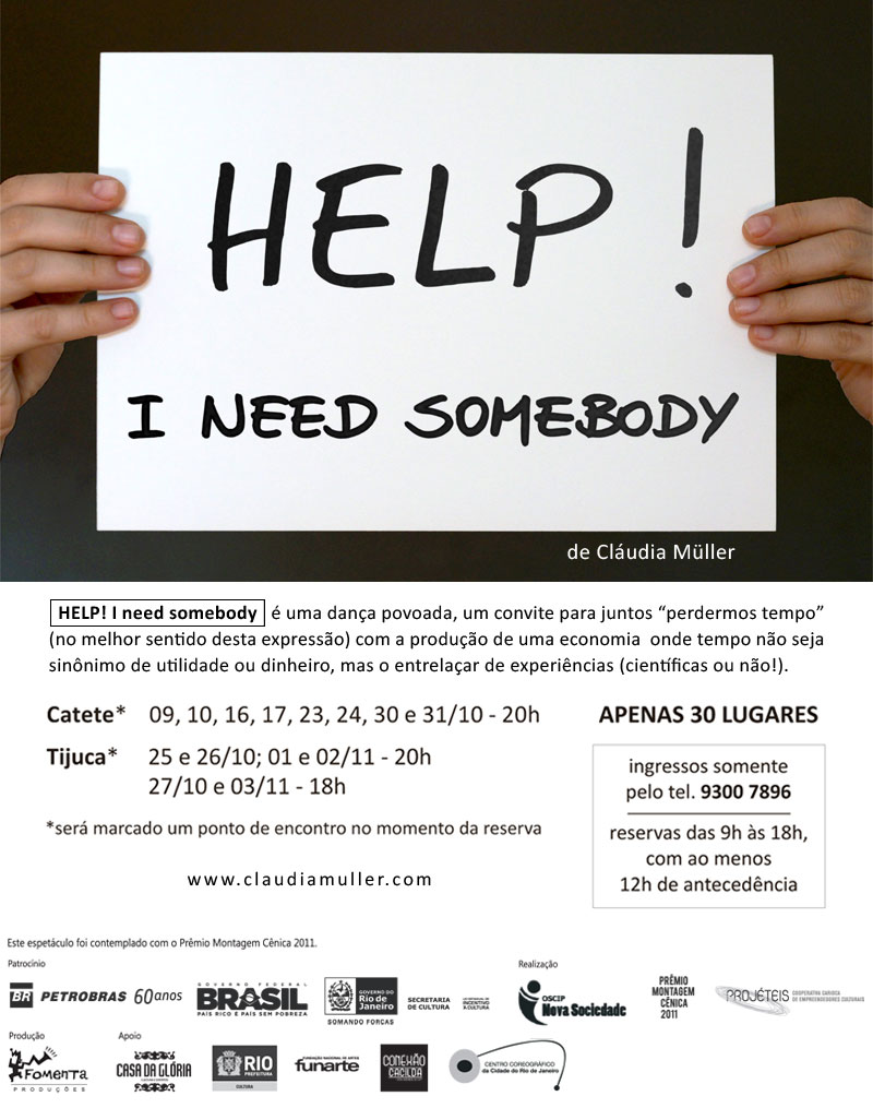 Dando continuidade a trabalhos que privilegiam o contato direto e troca de experiências com o público, tirando-o da posição de espectador passivo, Cláudia Müller realiza seu novo espetáculo de dança contemporânea, “Help! I need somebody” que mistura dança, música, performance e projeções. A coreógrafa que já realizou diversos projetos no Brasil e no exterior (Espanha, Portugal, Marrocos, Argentina, Uruguai, Chile, Colômbia, México, entre outros), propõe em seu mais recente trabalho um novo tipo de proximidade que vai desde o contato inicial para reservar um lugar na plateia, até um “serviço de atendimento ao espectador”, realizado após as apresentações onde as pessoas podem contar aos artistas suas impressões sobre o espetáculo. HELP! acontece até 03/11 no Largo do Machado e Tijuca, parte na rua e parte nos teatros Cacilda Becker e Centro Coreográfico, se diferenciando na forma de acesso. “A pessoa me liga para reservar o lugar e marcamos um ponto de encontro com os performers. O questionamento é: em que momento começa o espetáculo? Ele começa quando recebo esse contato telefônico, nesse momento já iniciamos a aproximação com o público. Quero enxergar as pessoas, o público não é anônimo”, explica Cláudia.