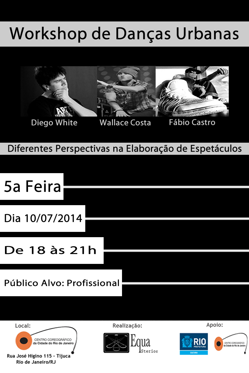O principal objetivo do workshop é ampliar a perspectiva de bailarinos e coreógrafos em relação à montagem de coreografias e espetáculos em geral. A atividade dará enfoque nas tendências contemporâneas de montagem coreográfica, sendo ministrada por Diego White, Fabio Castro e Wallace Costa