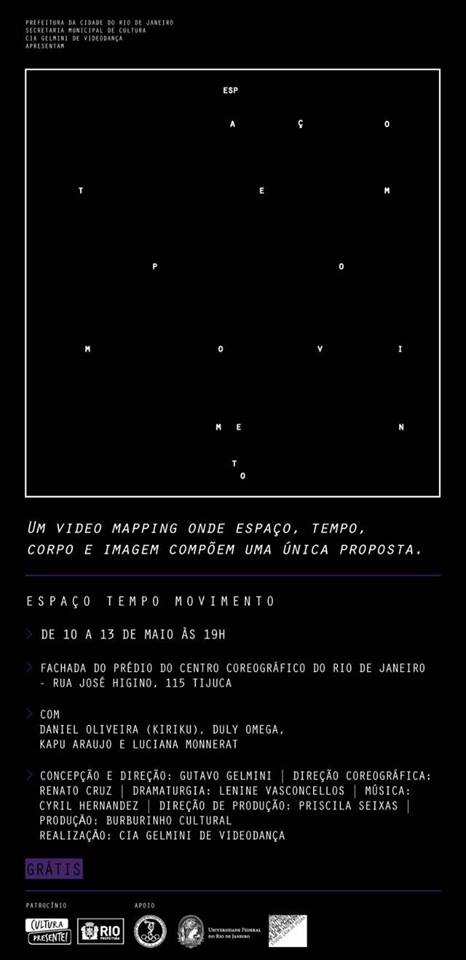 Após 10 anos trabalhando com videodança, Gustavo Gelmini inicia as atividades da Cia Gelmini de Videodança com “Espaço Tempo Movimento”. O espetáculo vai cobrir de imagem, som e dança o prédio do Centro Coreográfico do Rio de Janeiro com o vídeo mapping, criação de Gustavo Gelmini, que convidou Renato Cruz para diretor coreográfico e Lenine Vasconcellos para dramaturgia.