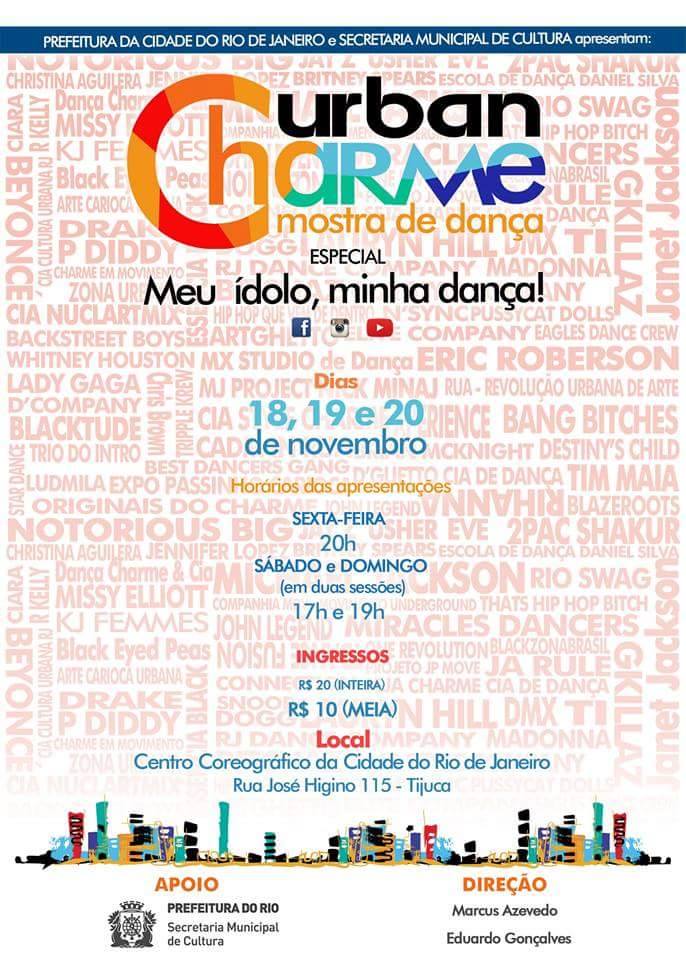 Grandes apresentações de DANÇAS URBANAS do Charme, do Funk e do HIP HOP se encontram na MOSTRA URBAN CHARME – Edição Especial “Meu ídolo, Minha dança”. Grupos e cias apresentam no palco trabalhos temáticos de seus ídolos prediletos.