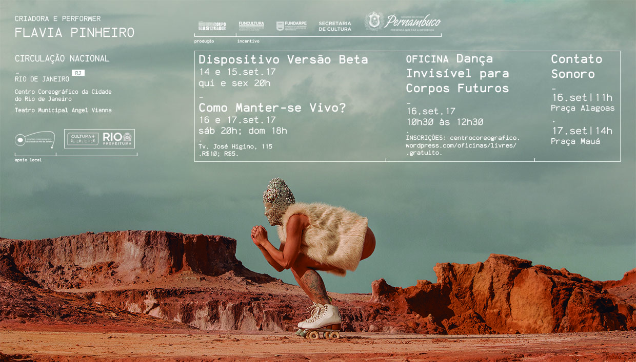 Diafragma: Dispositivo versão Beta Data: 14 e 15 de setembro 2017 Horários: Quinta e sexta, 20h Valor: R$10,00 (inteira) e R$5,00 (meia) Duração: 40 minutos Local: Teatro Angel Vianna Classificação: 16 anos Como manter-se vivo? Datas: 16 e 17 de setembro de 2017 Horário: sábado 20h e domingo 18h Duração: 40 minutos Valor: R$10 (inteira) R$5 (meia) Local: Teatro Angel Vianna Classificação: livre