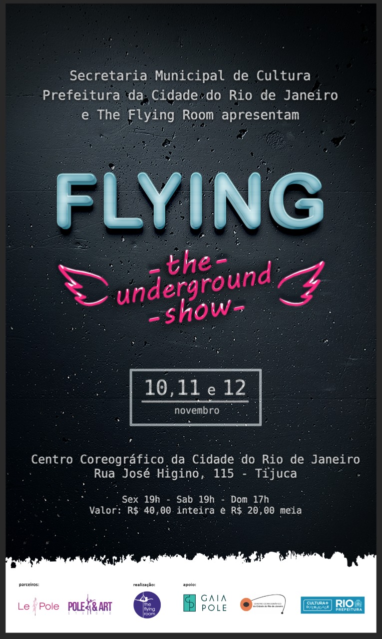 O Pole dance, assim como outros estilos de dança vivenciaram, encontra dificuldades para obter o reconhecimento e respeito, arte, entretenimento ou até mesmo atividade física. Antes de serem abraçados pelo meio artístico, estilos de dança como o ballet, a salsa, o tango e, especialmente, a famosa dança do ventre, eram danças associadas à sexualidade e a luxúria, sofrendo assim enorme criticismo durante anos. Flying -The underground show foi feito com o intuito de apresentar a arte que criamos quando estamos em interagindo com um Pole. Apesar da paixão por essa dança, para alguns de seus praticantes, por motivos profissionais e até mesmo familiares, sua exposição é algo proibido e impensável, por isso, este não deixa de ser nosso universo underground. Desejamos sair do imaginário popular das casas noturnas e trazer um novo e variado ponto de vista. Não renegamos o sexy, mas também podemos ser líricos, esportivos, contemporâneos, etc. Nos dias 10 e 12 haverá uma mostra dos alunos e profissionais do The Flying Room, com participação de alunos dos estúdios Le Pole e Pole & Arte. O The Flying incentiva a todo instante a criação artística de seus alunos, oferecendo inclusive horários gratuitos de ensaio durante todo o ano. The underground show, é a oportunidade de apresentação do universo particular de cada um deles. No dia 11 apresentaremos um pouco da história do pole dance com a Cia The Flying Room, mostrando desde os primórdios das tribos aficanas, até os dias de hoje.