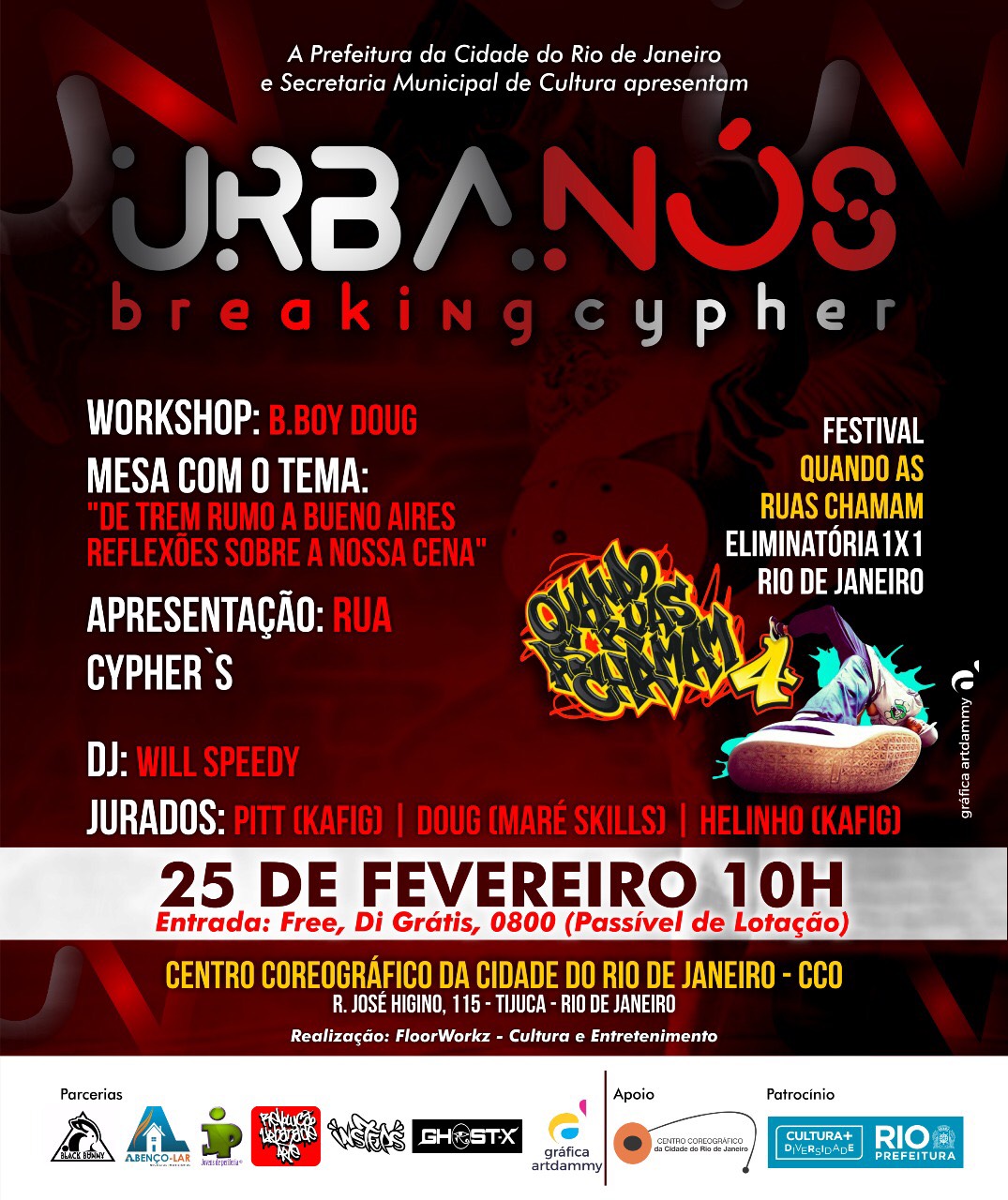 UrbaNós Breaking Cypher vêm da necessidade de um fortalecimento identitário cultural voltado para as artes e culturas de periferias onde o poder público infelizmente o negligencia, sendo assim pertinente a criação de um encontro onde fomente as linguagens oriundas dos guetos cariocas como a Dança Breaking, para que cada vez mais possamos fortificar dentro da nossa sociedade raízes afrodescendentes que caracterizam a Multiculturalidade do nosso povo. Em parceria com o Festival Nacional de Breaking o “Quando as Ruas Chamam” que este ano estará na sua Quarta edição e dentro do nosso evento selecionaremos uma vaga para a final nacional prevista para Abril.