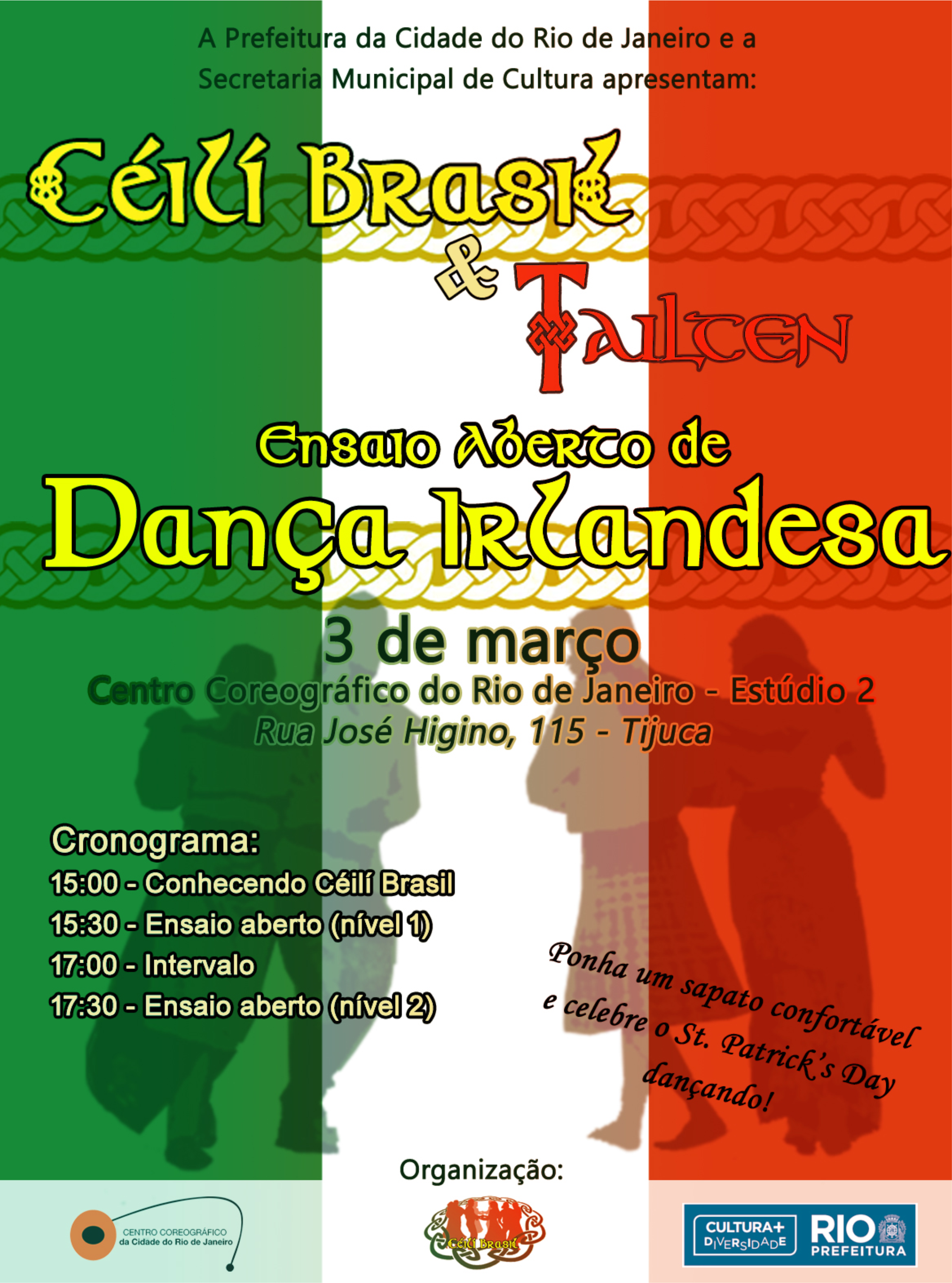 Sempre sonhou em participar de um autêntico baile do século XIX? Essa é a sua chance! O Grupo Céilí Brasil convida os entusiastas a participar de um ensaio aberto de um estilo de dança singular: a irish céilí, ou como pode ser chamado em português, o baile irlandês. São danças tradicionais irlandesas, coreografadas em grupos de 8 pessoas, em formato de roda ou quadrado, com movimentos coordenados e padrões geométricos. Para compor nosso ensaio-baile, os músicos da banda Tailten, especializada em música tradicional irlandesa, estarão conduzindo estilos de música conhecidos como jigs e reels, típicos das céilí. É uma oportunidade para expandir seus horizontes e se aproximar da cultura irlandesa e das formas de dança praticadas naquele país.
