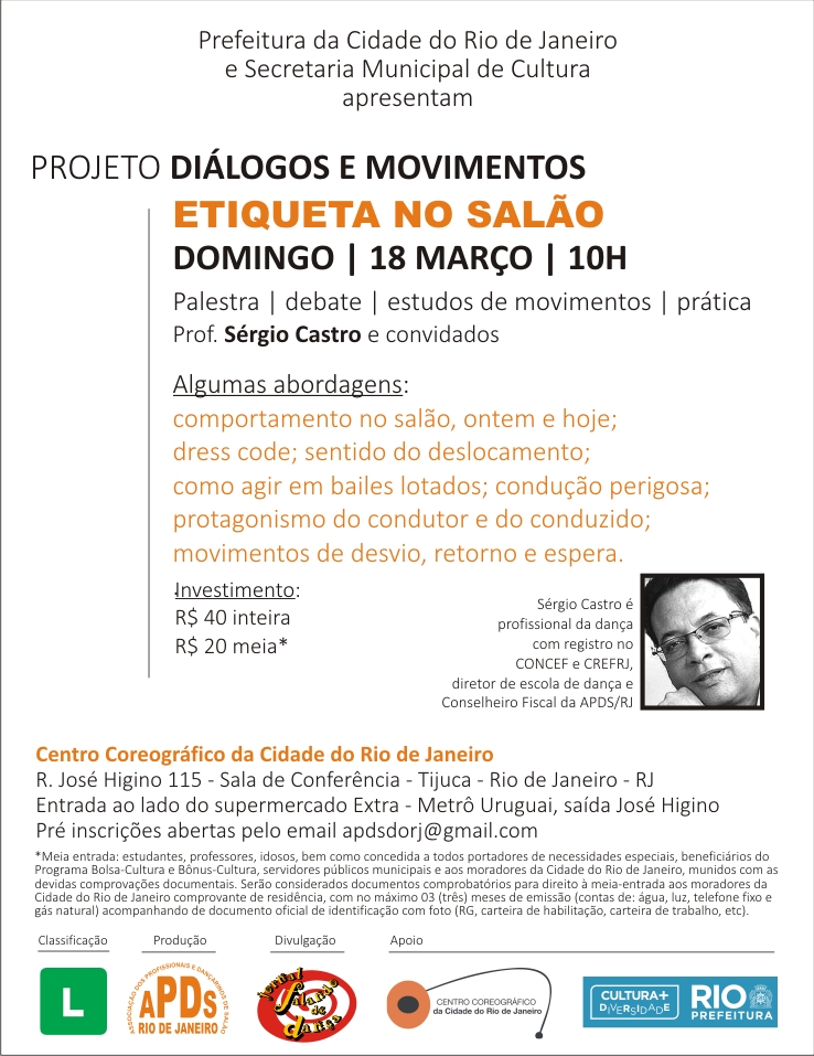 Serviço: Data: 18 de março de 2018 Horário: 10h às 16h Valor do Ingresso: R$ 40,00 Público alvo: profissionais de dança, pesquisadores, estudantes, praticantes e amantes da dança de salão do Rio de Janeiro Público esperado: 60 pessoas Local de venda: Bilheteria do Centro Coreográfico. Classificação: Livre Informações: apdsdorj@gmail.com
