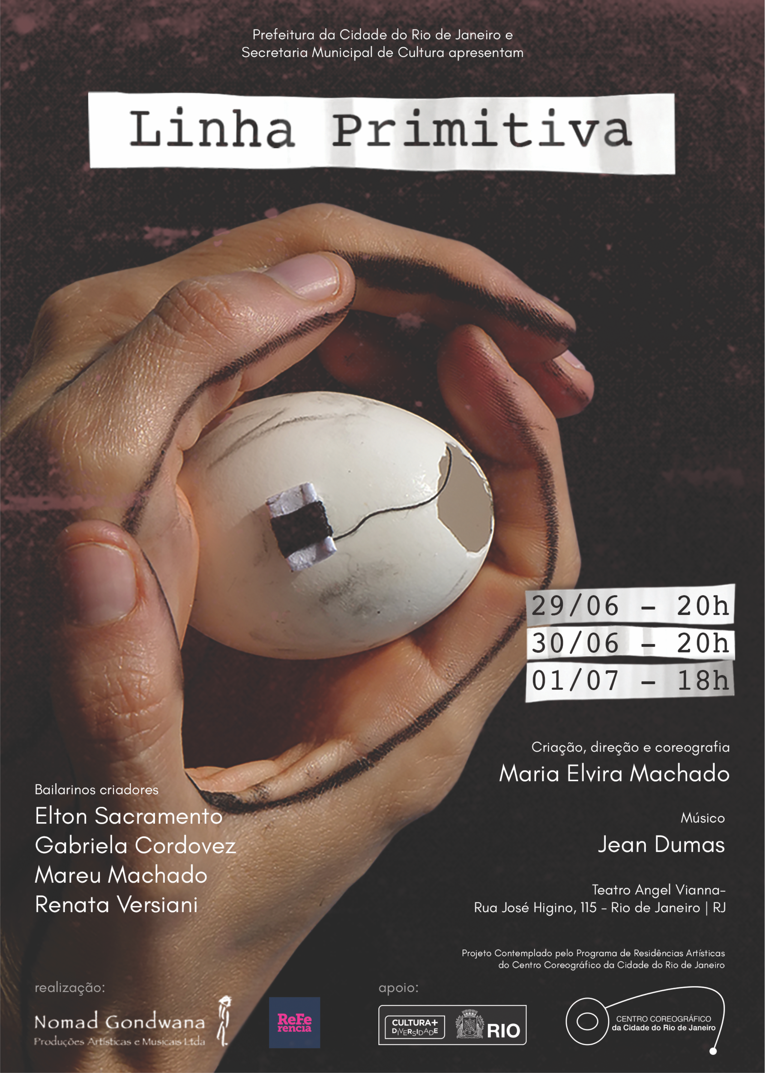 “Dá para dançar enquanto se pensa? – eis a questão. Será que dá? Dá para dançar se estivermos pensando? Não posso acreditar numa dança que tenha nascido do pensar. Para mim, o importante é esse sentimento, de achar, de repente, a beleza num bebê. Não se trata de entender com a cabeça. No ventre materno, criou-se um pouquinho de vida. No vente materno, há coisas que deixamos de falar, de ouvir, de ver, que deixamos escapar, por isso que ficam, de leve, alguns desses fragmentos. Por isso fico com vontade de lhes dizer que “pensar, não pode…” Kazuo Ohno – Treino e(m) poema. Linha Primitiva coloca em desafio o encontro entre quatro artistas que desejam explorar a dança e a música da carne, das vísceras, dos gestos. Uma busca pelo encontro com fantasmas e espíritos que se formam e se deformam através da matéria real e as vezes imaginária de linhas. A movimentação do trabalho surge a partir dos estudos biológicos da chamada Linha Primitiva, uma estrutura característica da gastrulação* de répteis, aves e mamíferos. Sua formação se dá na proliferação e migração das células até o nó primitivo. Assim que a linha primitiva surge, é possível identificar o eixo cefálico-caudal de um embrião.