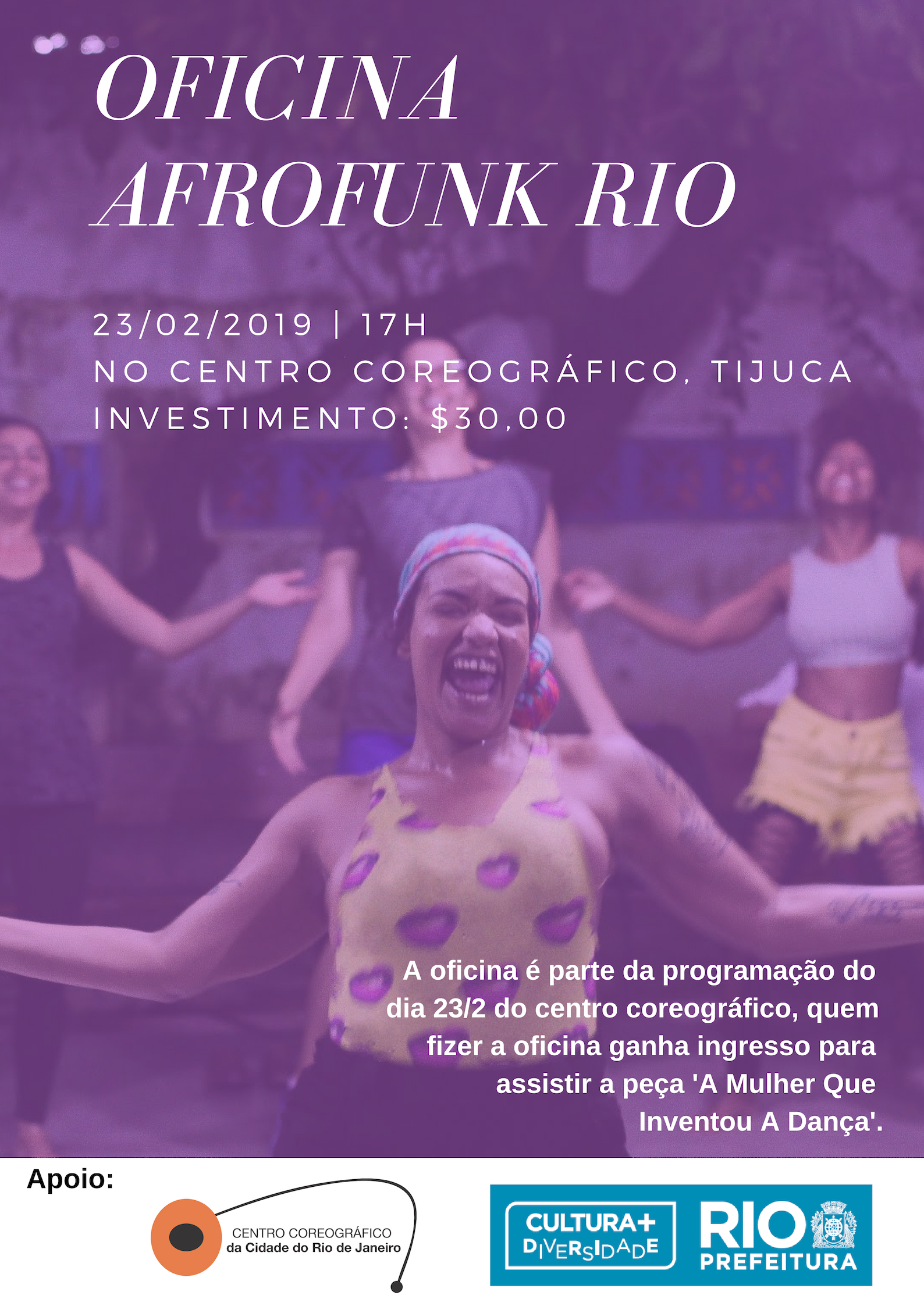 Data: 23 Fevereiro de 2019 Horário: sábado - Oficina das 17h. Valor do Ingresso: Oficina 30,00 Local de venda: afrofunkrio@gmail.com / 21 971224691. Classificação: 16 anos Duração: 1:30 oficina Informações: afrofunkrio@gmail.com / 21 971224691