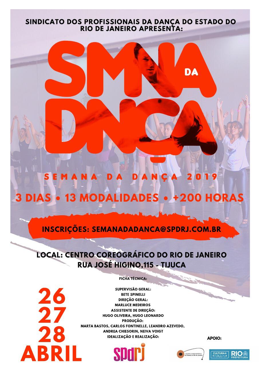 A Semana da Dança SPDRJ está na sua 4 edição. Sendo sempre realizada no CCO (Centro Coreográfico da cidade do Rio de Janeiro) por apresentar as instalações perfeitas para esse tipo de evento. Serão ministradas aulas de várias modalidades de dança, palestras, espetáculos, mostra não competitiva e performances. Todo o evento é produzido em parceria com profissionais de renome.