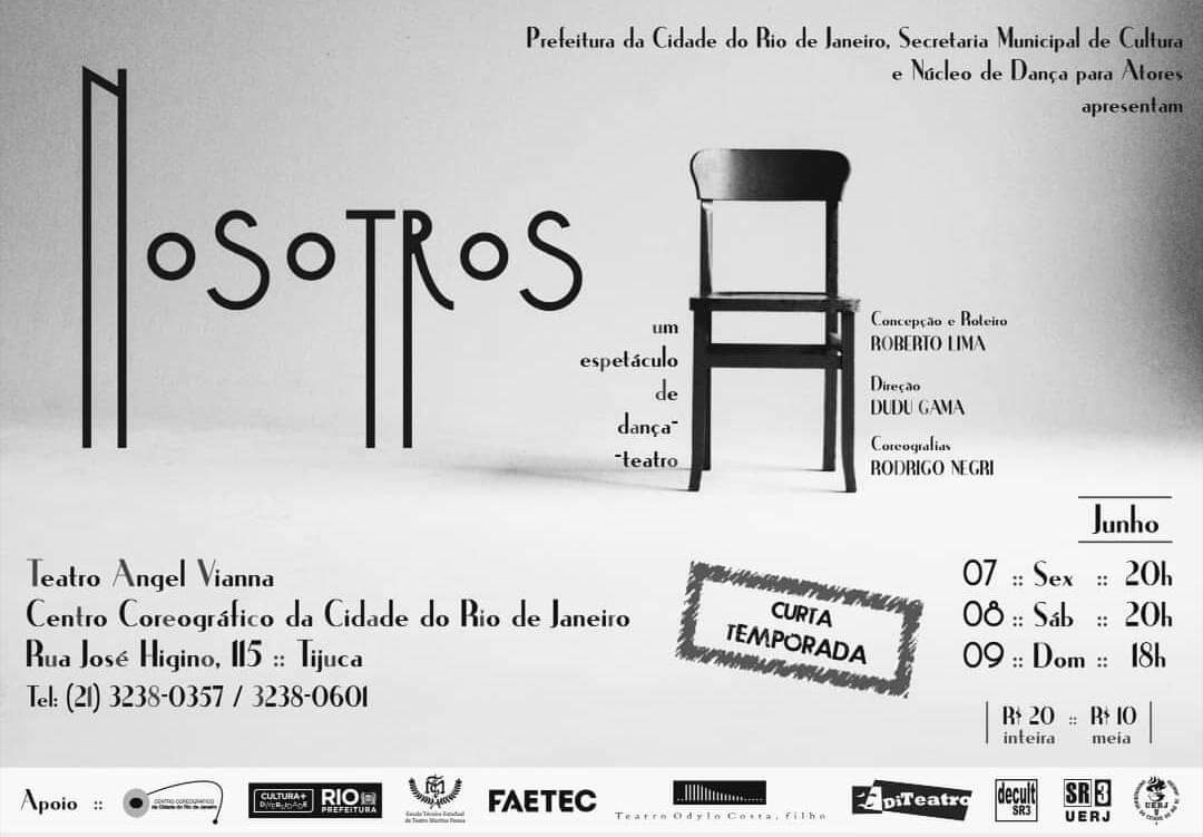 Serviço: Evento: NOSOTROS - Os Lirismos do Cotidiano Linguagem: Artes Cênicas Data: 07, 08 e 09 de junho Horário: Sexta e Sábado às 20h e Domingo às 18h Valor do Ingresso: R$20,00 inteira, R$10,00 meia Público alvo: Público em Geral Local de venda: Ingressos à venda na bilheteria do Centro Coreográfico nos dias do espetáculo a partir das 15h ou pela internet na plataforma https://riocultura.superingresso.com.br/ . Classificação: 10 anos Duração: 50 minutos