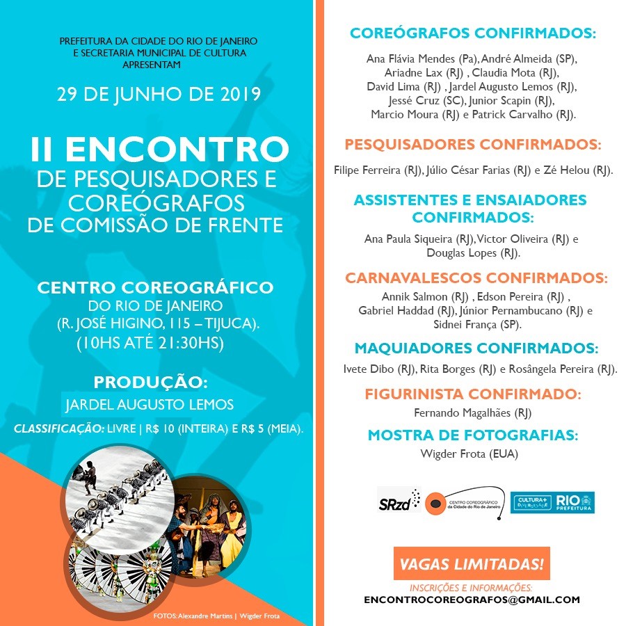 O 2º Encontro de Pesquisadores e Coreógrafos de Comissão de Frente acontecerá no dia 29 de junho de 2019, das 14 h até às 21:30 h, no Centro Coreográfico da Cidade do Rio de Janeiro. Um encontro com coreógrafos de comissão de frente de seis estados do Brasil, pesquisadores do quesito, carnavalescos, profissionais de figurino e maquiagem e jurados que abordarão temas como: formação dos coreógrafos; estilos e profissionalização; produção em Comissão de Frente; história das comissões de frente e criação coreográfica.