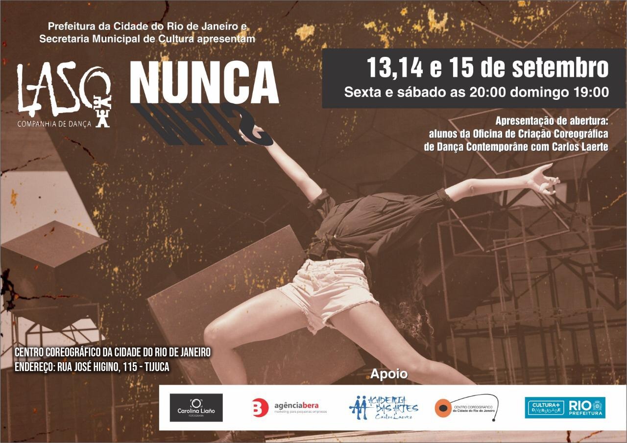 “Nunca Mais” é baseada em relatos reais dos atores em cena, e questiona a qualidade das nossas escolhas em relação ao uso do nosso tempo, assuntos como racismo, homofobia, feminicídio e Alzheimer são expostos no palco através da dança. O espetáculo mistura encenação, dança e cinema, desafiando os intérpretes a construir uma apresentação sem volta, independente de onde esteja o seu começo. Este trabalho inédito do diretor e dramaturgo Carlos Laerte, com Jeniffer Rodrigues, Lucas Oliveira, Nayanne Cavalcante, Raphael Rodrigues e Thatila Paganotti no elenco.