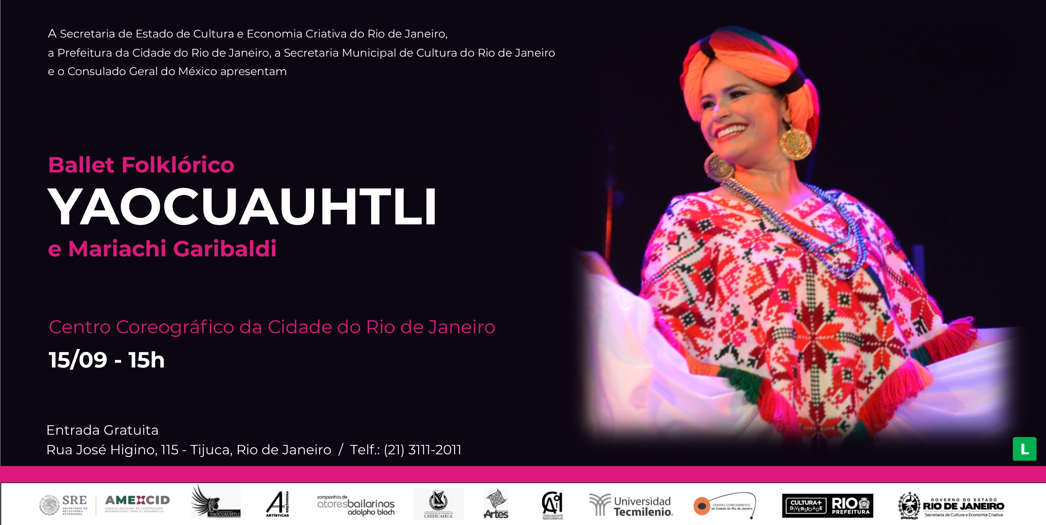 Serviço: Datas: 15 de setembro às 15h Valor dos ingressos: Gratuito Local de retirada: Bilheteria do Centro Coreográfico a partir das 15h nos dias do evento Classificação etária: Livre Duração: 90 min Informações: prensa@consulmexrio.com.br