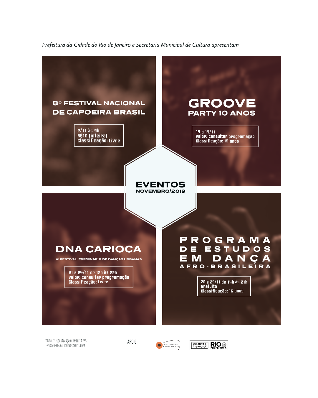 Sinopse/resumo: O coletivo Dança Negra Arte e Educação, em parceria com o IABACE – Instituto Afro Brasileiro de Artes Cultura e Educação CID/Unesco, realizam o primeiro encontro territorial de Estudos da Dança Afro Brasileira, que acontecerá no Centro Coreográfico do Estado do rio de Janeiro, nos dias 26 e 27 de novembro. O programa é um percurso de qualificação profissional para novos multiplicadores desta disciplina, que desejam descobrir seu potencial máximo potencial artístico/cultural , com especial atenção nas manifestações populares afro-brasileiras no campo da dança, teatro e artes integradas.