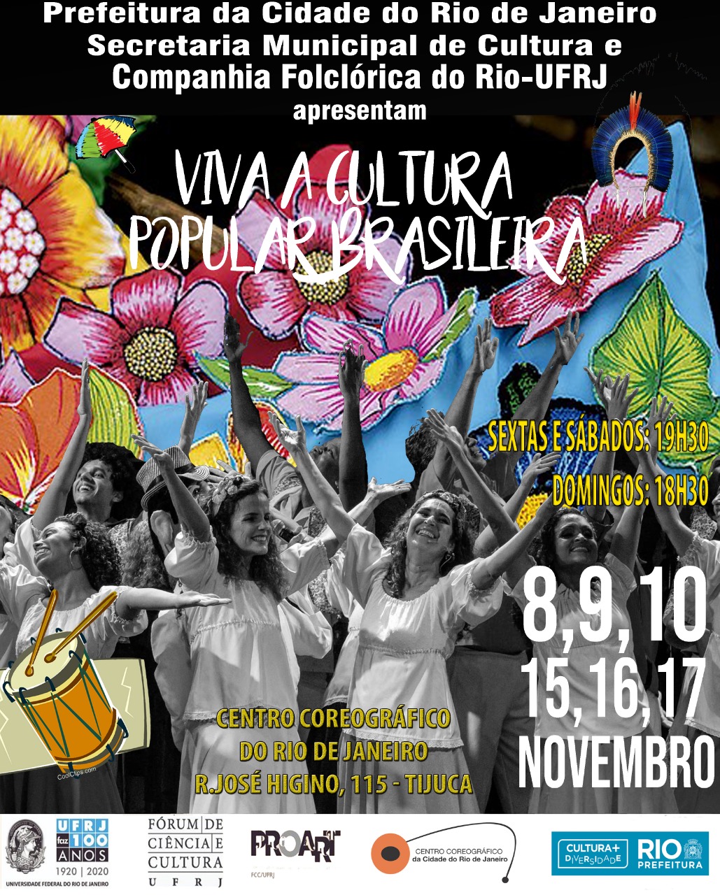 VIVA A CULTURA POPULAR BRASILEIRA! traz três temas em forma de dança e música ao vivo: corpos femininos que rodam saias e cuidam das riquezas culturais; as lutas pela terra através das artes populares e a liberdade e diversidade das ruas. Uma tradução das criações tradicionais e questões sociais. Um musical brasileiro. Tambores, cordas e sopros de Carimbós, Maracatus, Jongos; histórias dos povos originários e afrodescendentes se encontram com Chotes gaúchos, Frevos, Samba de Pareia, Dança de São Gonçalo e mais.