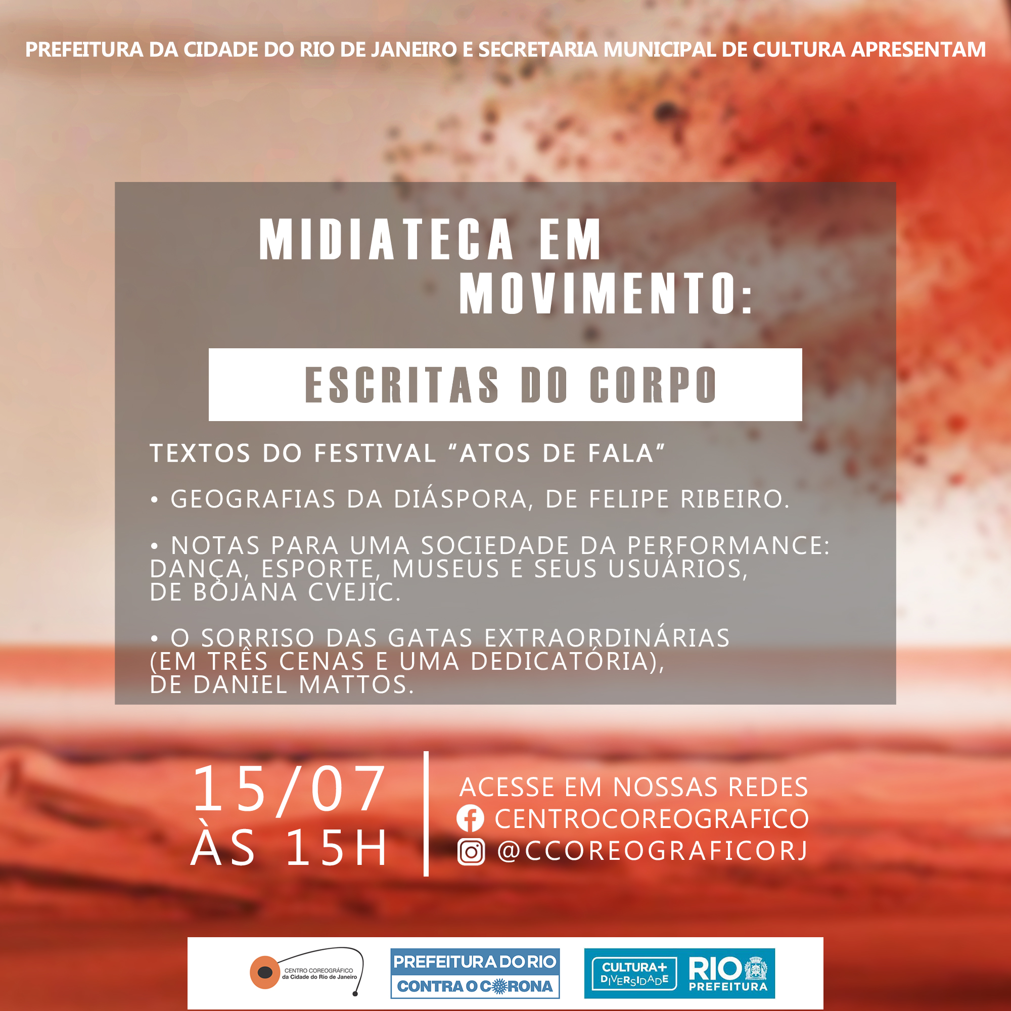 Dentro do projeto Midiateca em Movimento, a ação Escritas do Corpo pretende criar e disponibilizar um conjunto de informações online acerca de temas afins à área da Dança, do Corpo e do Movimento, a partir de reflexões-ações de criadores-pesquisadores que possam ser compartilhadas periodicamente com o público do CCo através de suas redes sociais. Esta ação, além de ampliar o acesso aos trabalhos produzidos, vai ampliando o debate sobre as inúmeras possibilidades de suportes onde o corpo pode se inscrever e escrever sobre si.