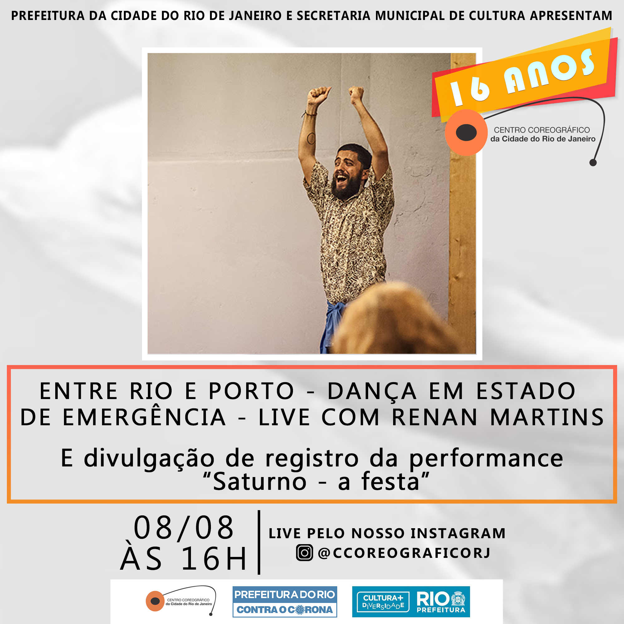 Serviço: Data: sábado, 08 de agosto Horário: 16h Link para acesso: IG @ccoreograficorj Classificação: livre Duração: 1h