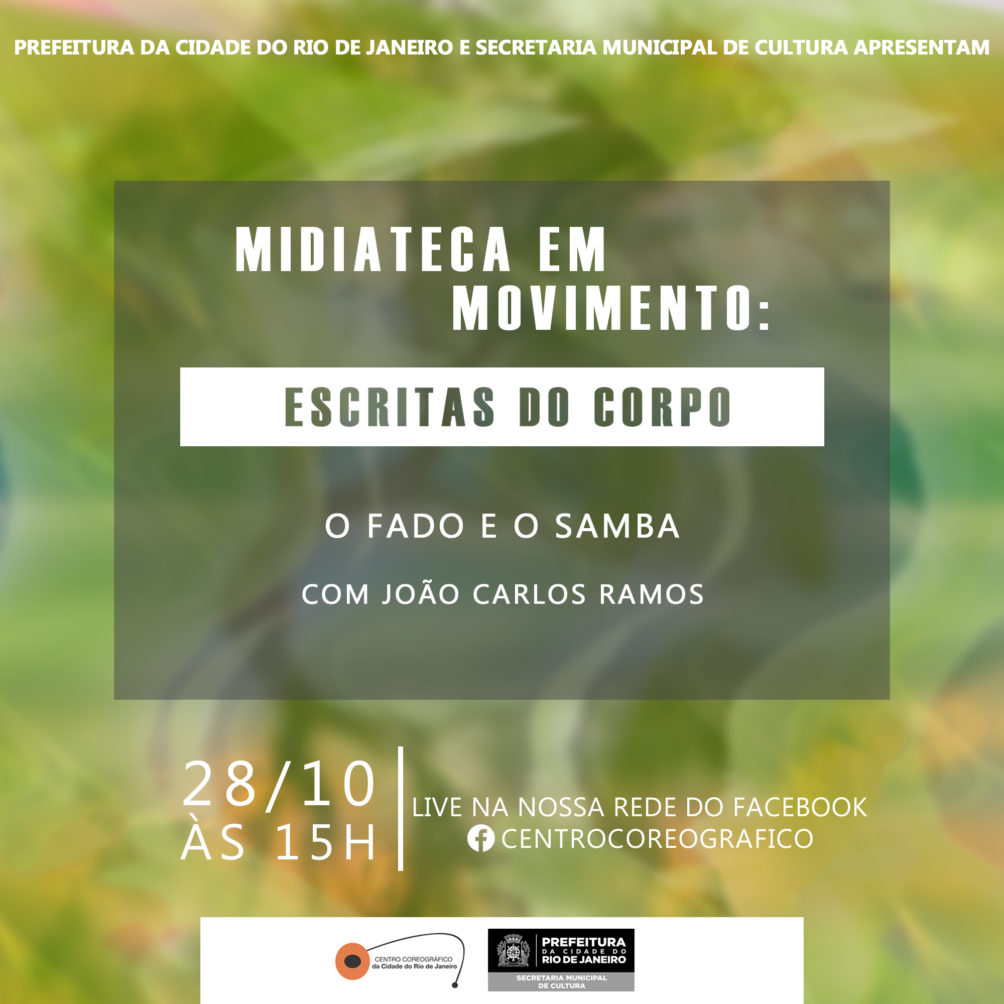 O Escritas do Corpo do dia 28 vai trazer uma conversa sobre o Fado e o Samba, com o coreógrafo, bailarino e diretor da Cia Aérea de Dança João Carlos Ramos. Essa conversa foi realizada no âmbito da residência artística, desenvolvida em 2016 no CCo por Cláudia Petrina acerca de seu mapeamento inicial sobre a Dança do Fado. A conversa, registrada em vídeo por Diego López, buscou rastrear alguma ligação possível entre a linhagem do Jongo, do Lundum, da Dança do Fado e do Samba.