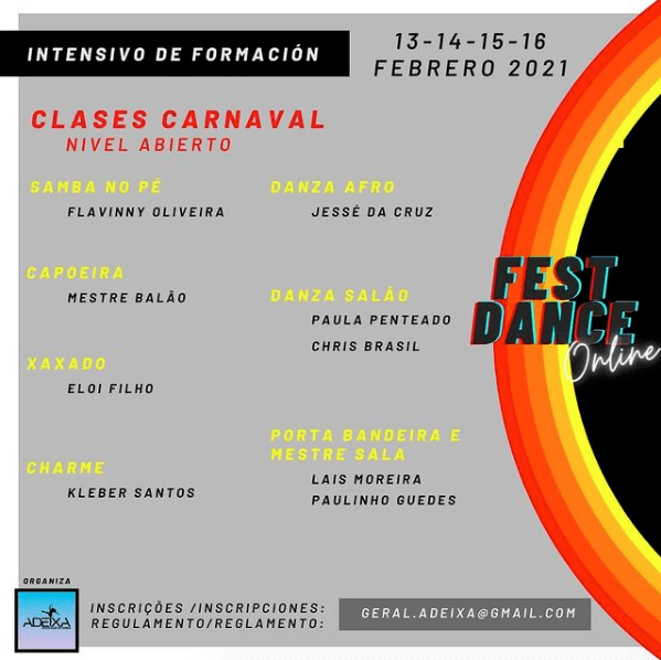 O Centro Coreográfico da Cidade do Rio de Janeiro, em parceria com o grupo Adeixa, abre inscrições para vaga de bolsista no Fest Dance 2021. As categorias disponíveis são para as turmas de 13 anos em diante e para a turma de carnaval. O evento acontecerá no formato online nos dias 13, 14, 15 e 16 de fevereiro. Acesse o link do formulário abaixo para se informar das regras e condições para a participação neste processo.