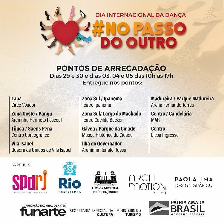 É uma ação solidária, em comemoração ao dia internacional da dança com parceria do SPDRJ – Sindicato dos Profissionais de Dança do Estado do Rio de Janeiro; Comissão Permanente de Cultura da Câmara Municipal do Rio de Janeiro; Câmara Municipal do Rio de Janeiro, Prefeitura da Cidade do Rio de Janeiro, Secretaria de Governo e Integridade Publica, Secretaria Municipal de Cultura, Funarte, CET – Rio e Guarda Municipal.