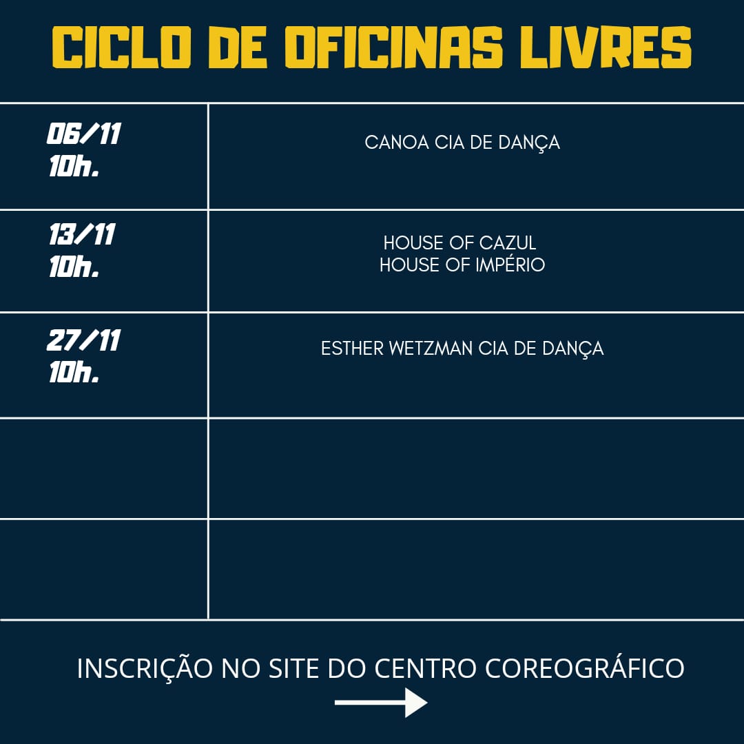 Os ciclos de oficinas livres são oferecidos pelas companhias que utilizam os espaços do Centro Coreográfico para residências de criação coreográfica. A oficina aberta a todos os públicos é uma abordagem prática de dança sobre a linguagem trabalhada pela cia.