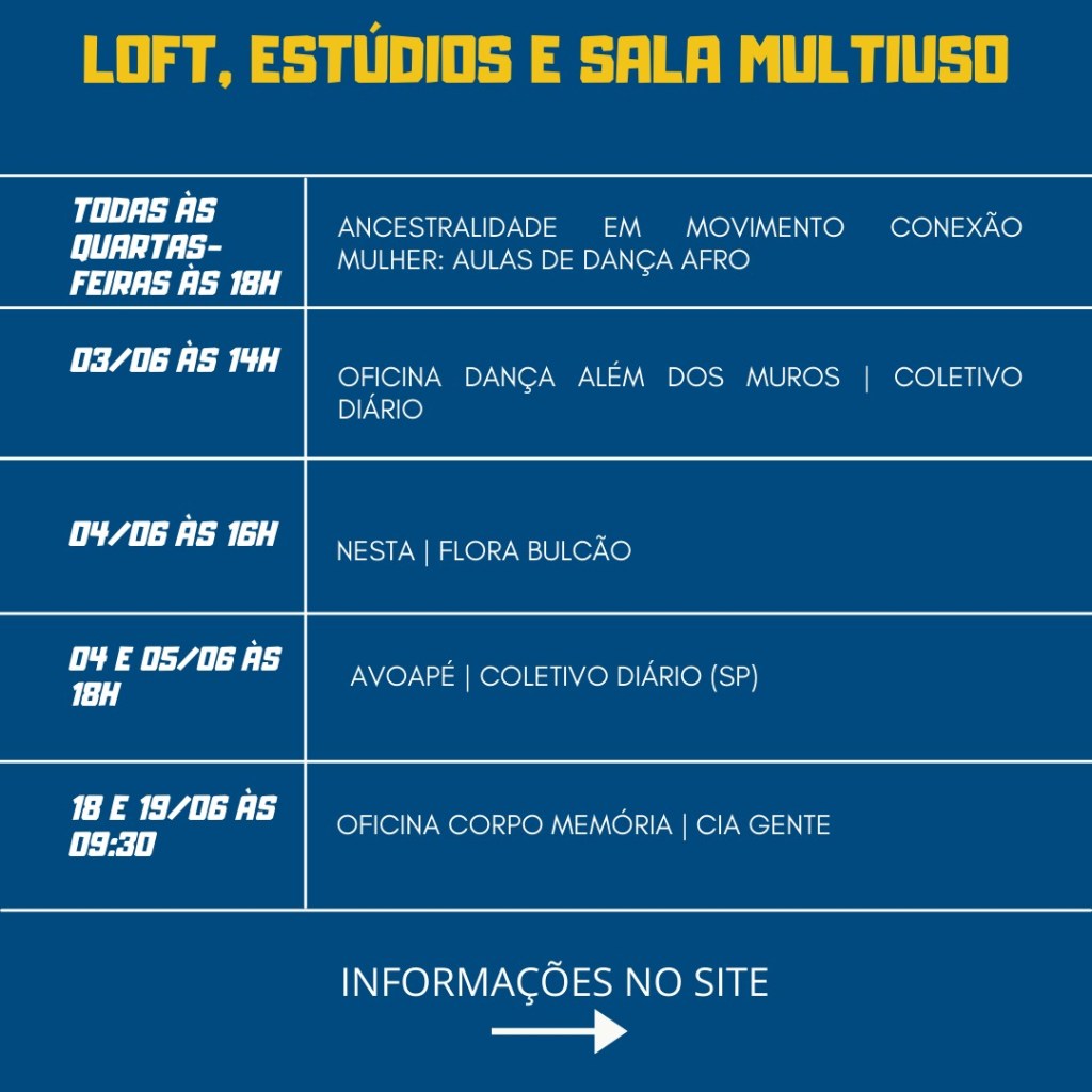 Junho! Um mês recheado de grandes atrações apoiadas pelo FOCA – Programa de Fomento à Cultura Carioca. Outra grande novidade é a chegada dos participantes do Programa Aprendiz Cultural para um longo ciclo de vivência dentro do dia a dia do nosso espaço da dança.
