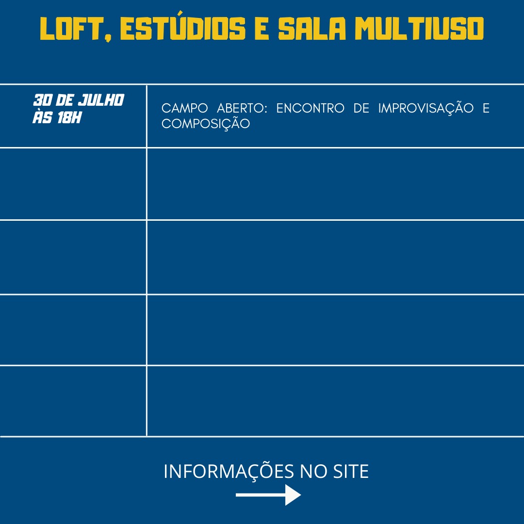 Resumo: O Campo Aberto é uma experiência em improvisação e convívio iniciada durante a pandemia, que começa a transformar-se em ação presencial. A prática aconteceu por dois anos ininterruptos e contou com pessoas de vários estados brasileiros e também estrangeiros. Para a versão presencial a proposta é um jogo de estruturas improvisacionais que vão sendo ativadas pelos pesquisadores improvisadores do núcleo campo aberto, ao mesmo tempo que convidam outros improvisadores e/ou curiosos a mergulharem nessa experiência.