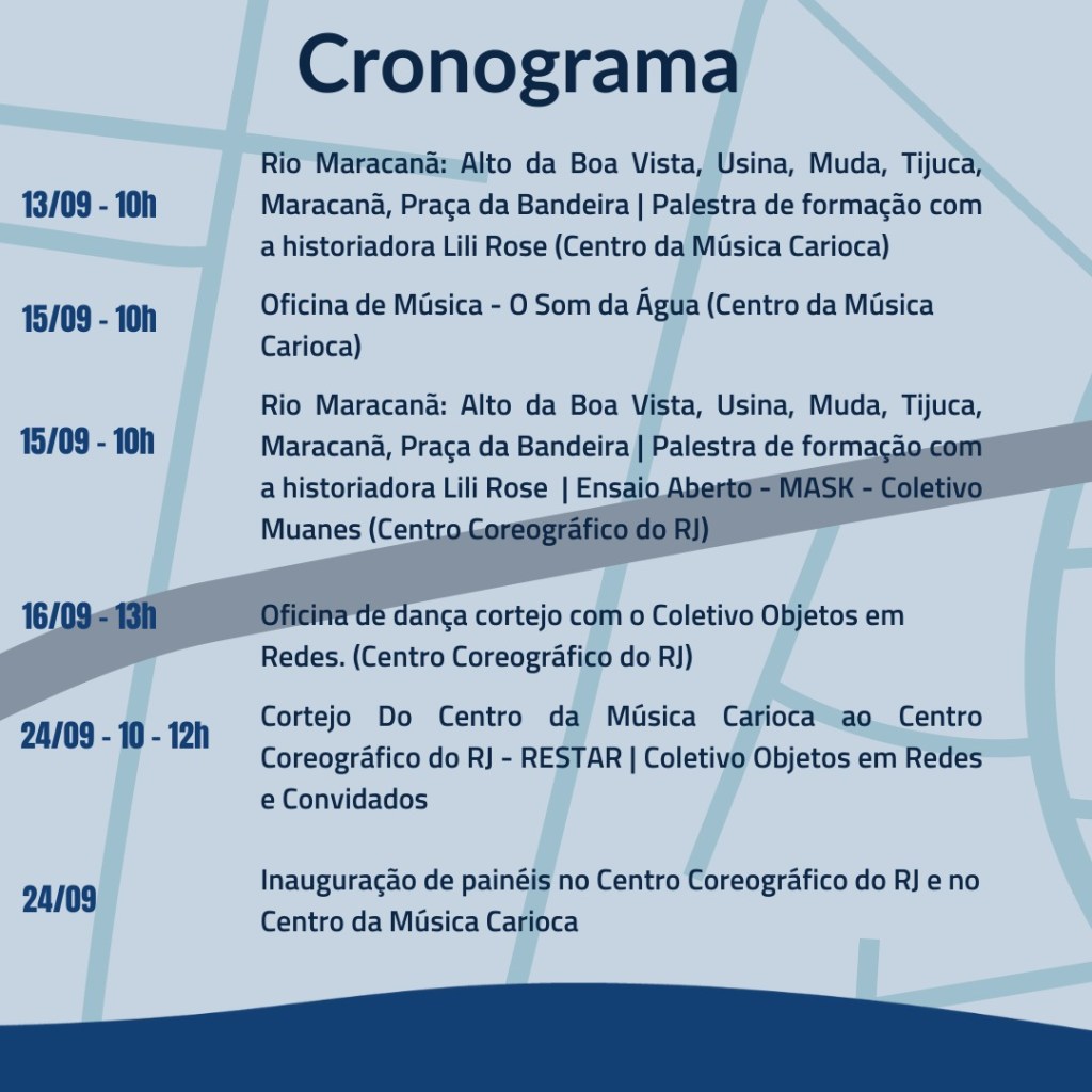 Cortejo Artístico que tem a ÁGUA como tema principal. Busca trabalhar a memória afetiva da população acerca do Rio Maracanã através de uma pesquisa pautada no percurso do rio, desde sua nascente até o trecho situado entre o Centro ;da Música Carioca e o Centro Coreográfico do Rio, culminando na inauguração de painéis informativos sobre o processo, dentro de cada Centro Cultural. O projeto conta com atividades de mobilização de público que antecedem a realização do cortejo através palestras, oficinas e ensaios. A intervenção é iniciada no Centro da Música Carioca, na da Avenida Maracanã com a Rua Garibaldi, passa pela Praça Xavier de Brito e se desloca até a Rua José Higino, no Centro Coreográfico.
