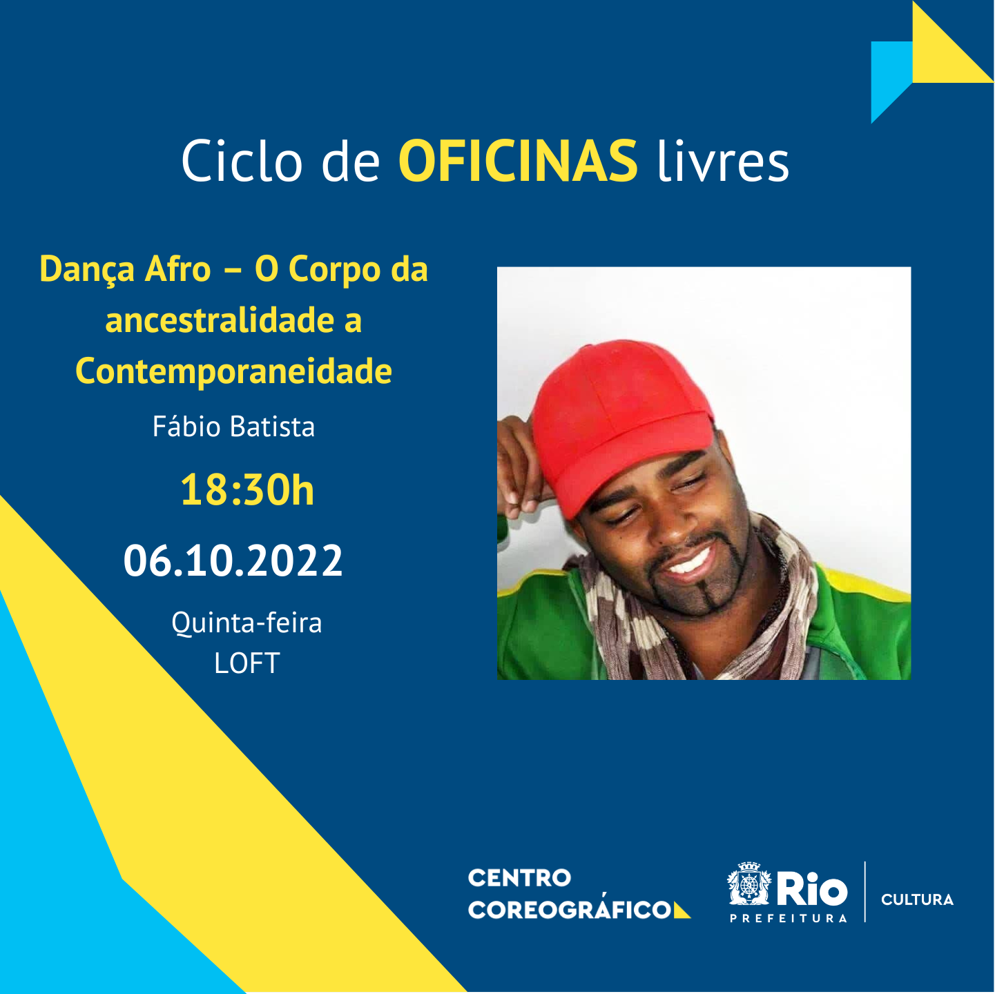 Iniciamos o mês de Outubro com mais uma oficina de longa duração. Desta vez, dança afro com Fábio Batista. A oficina vai possibilitar uma vivência com um repertório de movimentos da Dança Afro, sob perspectiva do corpo que procura a Ancestralidade Africana através da Dança dos Orixás e encontra seus reflexos na formatação da Dança Negra Contemporânea.