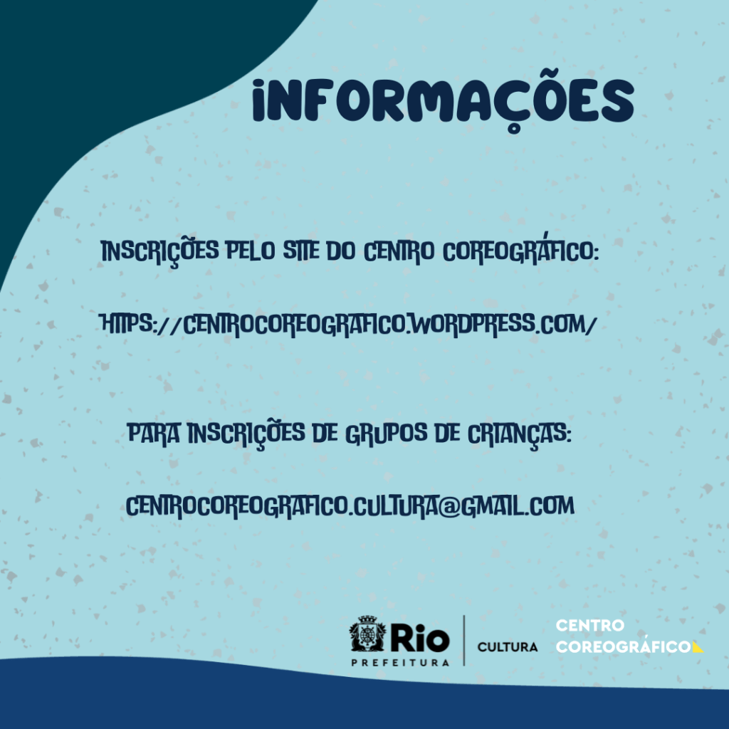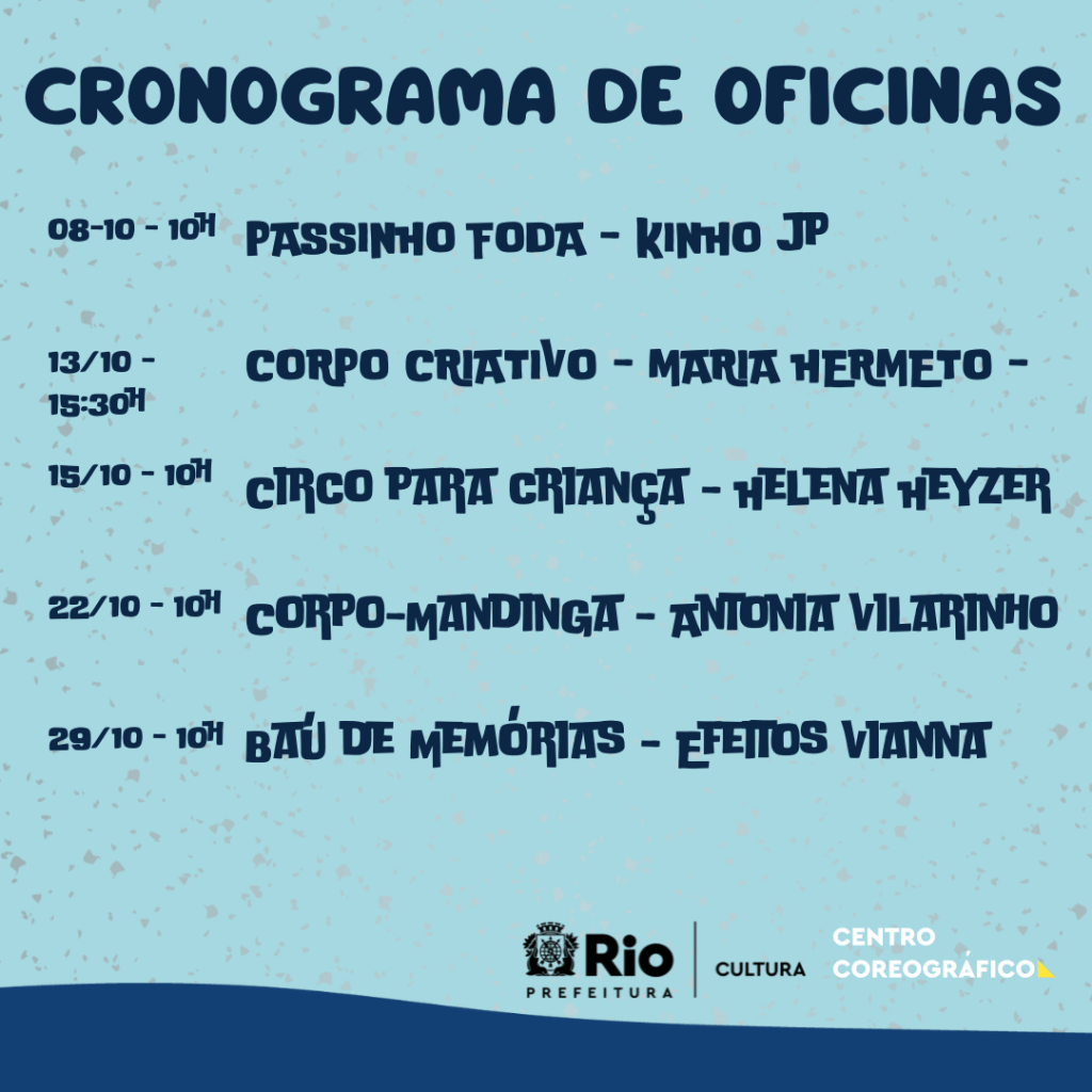 As atividades começam neste sábado dia 08 e seguem até dia 29 de Outubro e são oferecidas por artistas e companhias residentes no Centro Coreográfico. Todas as oficinas ocorrerão aos sábados às 10h, exceto a oficina “Corpo Criativo”, que ocorre na quinta-feira às 13h