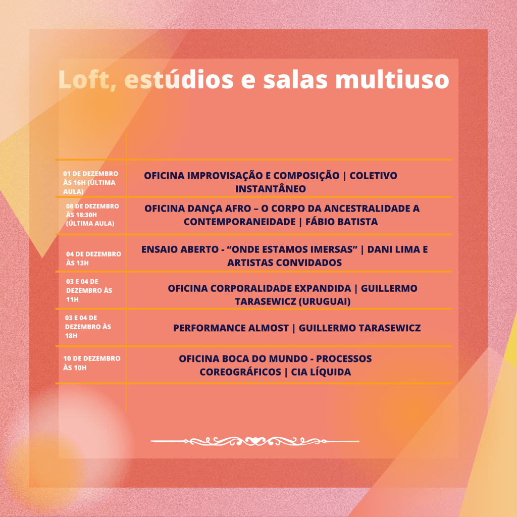 Público-alvo: bailarinos, estudantes de artes e demais áreas, professores, pesquisadores, adolescentes, jovens, adultos, comunidade local.