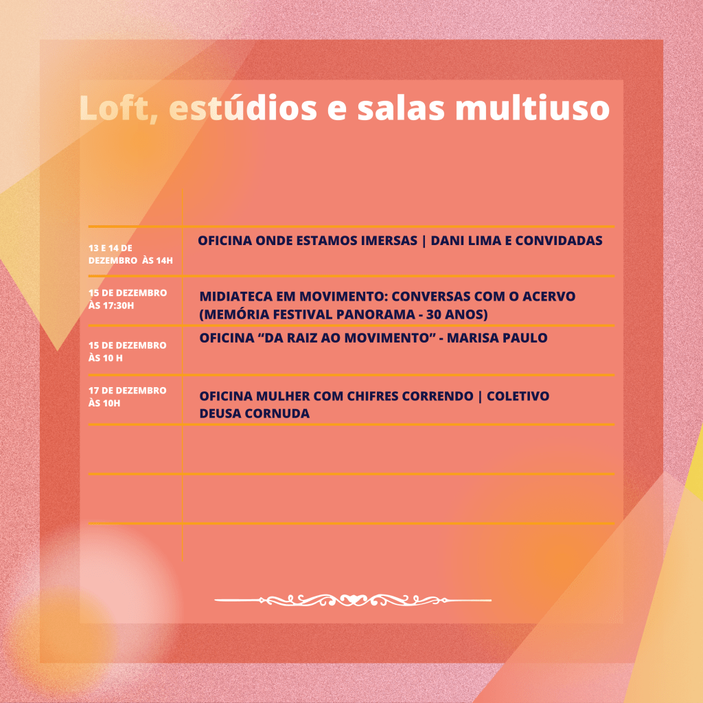 A oficina é oriunda do processo criativo referente ao espetáculo “Mulher com Chifres Correndo” (2022, Dir. Cecília Hadassa | Coreografia e Performance: Dandara Ferreira | Direção de Produção: Priscila Manfredini), que narra a história de uma mulher preta e brasileira se descobrindo enquanto uma deusa primordial. A partir do seu contexto social e histórico, ancestralidade, conexão com a natureza e a exaltação da cultura preta carioca e favelada. Desse modo, o objetivo da oficina é estimular as potências elementais que habitam as mulheres através de trabalhos corporais como o rebolado, a relação de dor e prazer, de contatos e apoios (com o chão e objetos) e com a música.