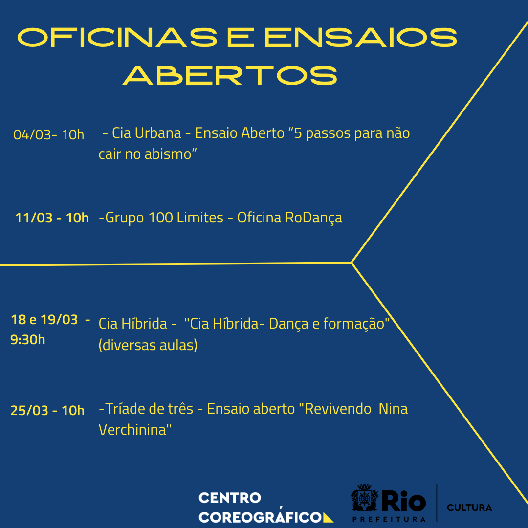 Durante o mês de Março nossos residentes oferecem uma série de ensaios abertos e oficinas. A Cia Urbana de Dança abre o mês no dia 4 de Março com o ensaio Aberto ” 5 passos para não cair no abismo”, às 10h. No sábado dia 11 de março é a vez do Grupo 100 Limites, uma jovem companhia de dança que trabalha a dança contemporânea adaptada, a oficina “RoDança” aposta na interação de cadeirantes e andantes. No dia 18 e 19 de Março a Cia Híbrida traz uma série de oficinas com diversas linguagem dentro das danças urbanas. Finalizando o mês, temos a Tríade de três, no dia 25 de março, com o ensaio aberto “Revivendo Nina Verchinina”, onde apresenta sua pesquisa sobre a dança moderna de Nina Verchinina.