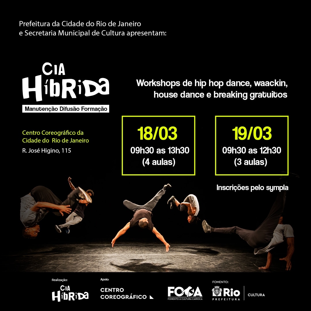 Resumo: Para inaugurar o projeto Cia Híbrida – Formação Manutenção, difusão, formação, aprovado pelo FOCA, serão oferecidas no Centro Coreográfico 7 oficinas ministradas pelos próprios bailarinos da Híbrida, nos mais diversos estilos de danças urbanas.