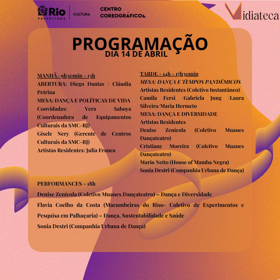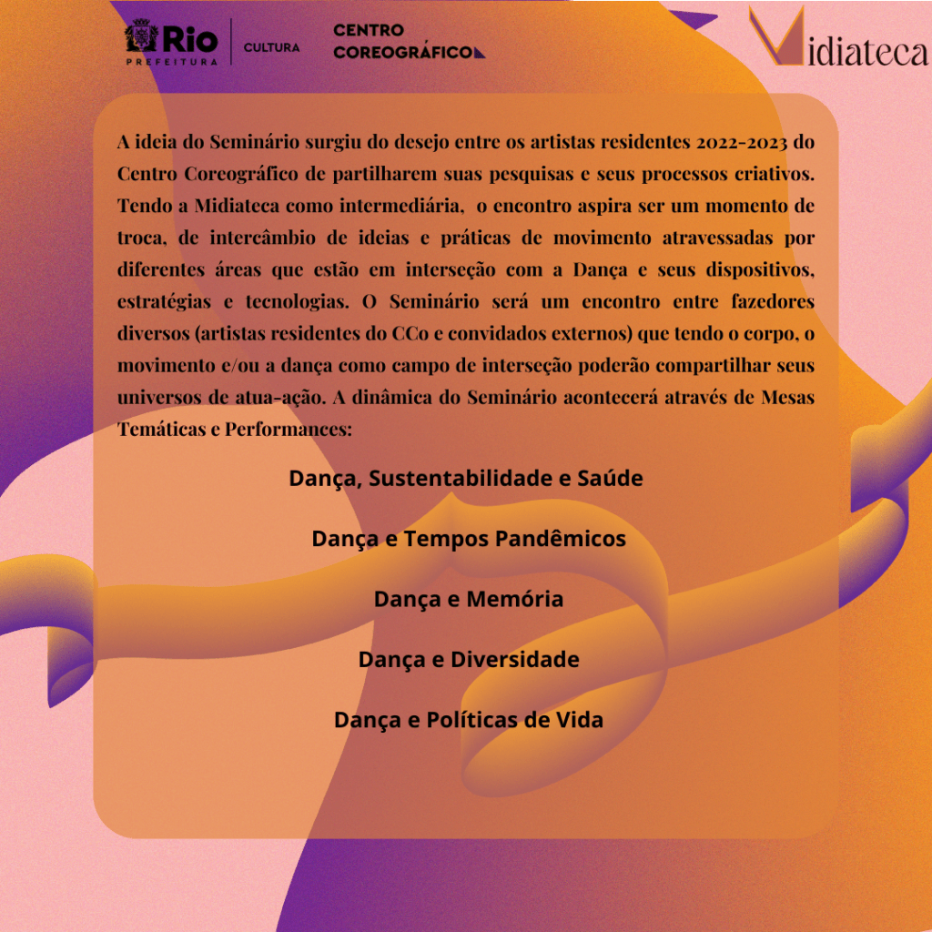 Resumo: A ideia do Seminário surgiu do desejo entre os artistas-residentes 2022-2023 de partilharem suas pesquisas e seus processos criativos. Tendo a Midiateca como intermediária, o encontro pretende ser um momento de troca, de intercâmbio de ideias e práticas de movimento atravessadas por diferentes áreas que estão em interseção com a Dança e seus dispositivos, estratégias e tecnologias. O setor de Acervo, Memória e Pesquisa (Midiateca) do Centro Coreográfico será o setor responsável pela organização do evento. A Midiateca vem desde 2020 implementando diversas ações (online e presenciais) transdisciplinares com diferentes profissionais de conversas com a Dança, tendo a perspectiva de “acervo vivo” e “memória em movimento” como conceitos norteadores. Nesse sentido, o Seminário será um grande encontro entre fazedores diversos (artistas-residentes do CCo e convidados externos) que tendo o corpo, o movimento e/ou a dança como campo de interseção (ponto de encontro) poderão compartilhar seus universos de atua-ação. A dinâmica do Seminário acontecerá através de Mesas Temáticas e Performances entre artistas residentes e convidados externos.