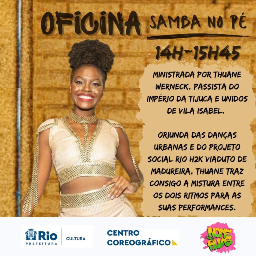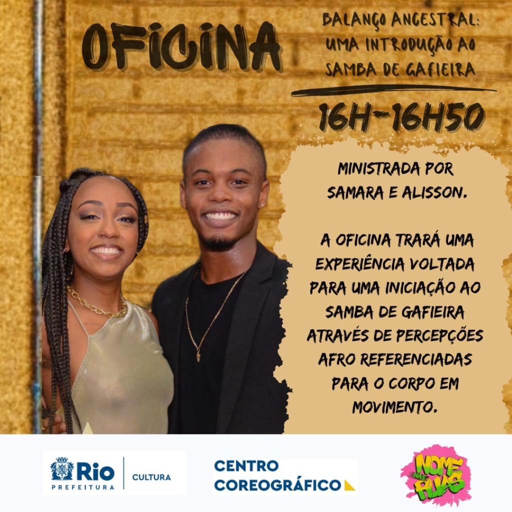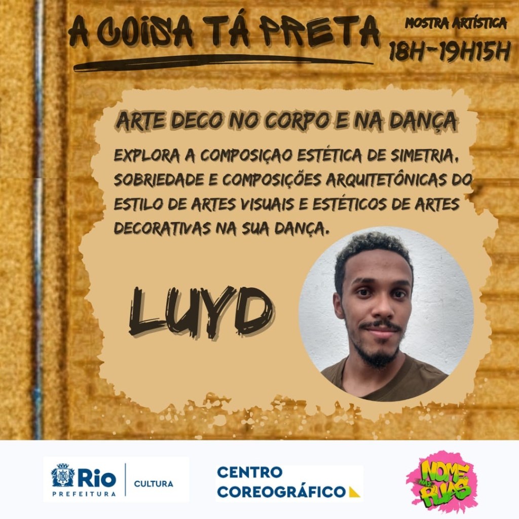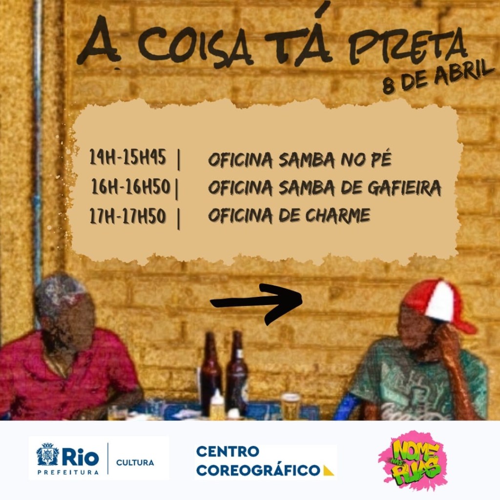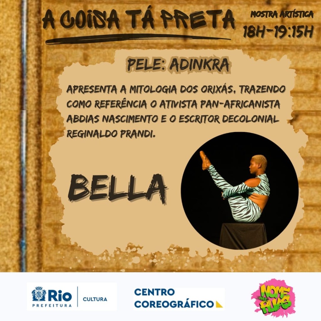 Resumo: O evento objetiva a mobilização e a produção de um espaço de troca de experiência preta, bem como, de sua dança em diferentes estilos e perspectivas tendo o Rio de Janeiro como enfoque. O evento se organizará, do Dia 08/04 (Sábado) a partir de duas oficinas e uma mostra atística com a temática: “O que pode o corpo negro?”.