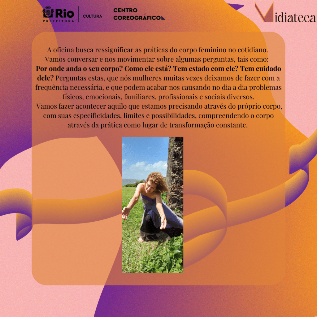 A oficina proposta pelo setor de Acervo, Memória e Pesquisa – Midiateca, busca ressignificar as práticas do corpo feminino no cotidiano. Vamos conversar e nos movimentar sobre algumas perguntas, tais como: Por onde anda o seu corpo? Como ele está? Tem estado com ele? Tem cuidado dele? Perguntas estas, que nós mulheres muitas vezes deixamos de fazer com a frequência necessária, e que podem acabar nos causando no dia a dia problemas físicos, emocionais, familiares, profissionais e sociais diversos. Vamos fazer acontecer aquilo que estamos precisamos através do próprio corpo, com suas especificidades, limites e possibilidades, compreendendo o corpo através da prática como lugar de transformação constante. A cada mês (de março a junho) uma mediadora orientará o encontro com base em suas pesquisas e práticas artísticas. Ao final dos encontros desenvolveremos uma criação coletiva com apresentação aberta ao público. As oficinas serão orientadas por Cláudia Petrina (Coordenadora do setor de Acervo, Memória e Pesquisa – Midiateca do Centro Coreográfico) e convidadas (artistas-residentes do Centro Coreográfico).