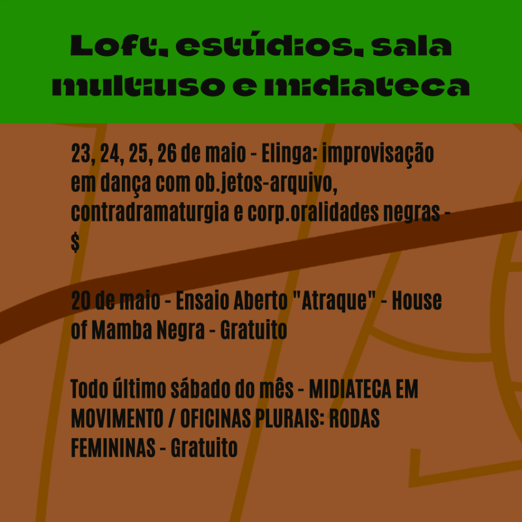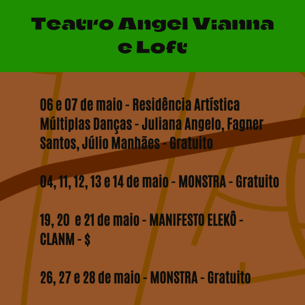 O ancestral e o contemporâneo se entrelaçam na programação de maio! Espaço para desenvolvimento de novos criadores negros, 6• edição da MONSTRA, MANIFESTO ELEKÔ, além das residências artísticas do Cco, ciclos de oficinas livres, ensaio aberto de ATRAQUE e rodas femininas!