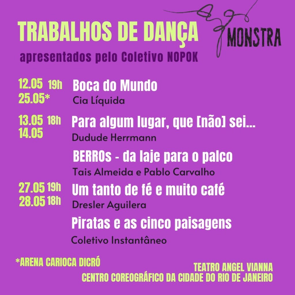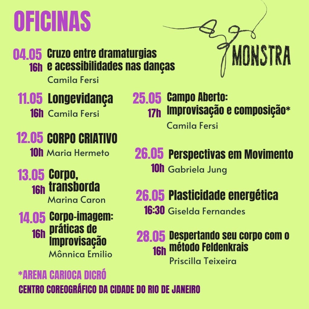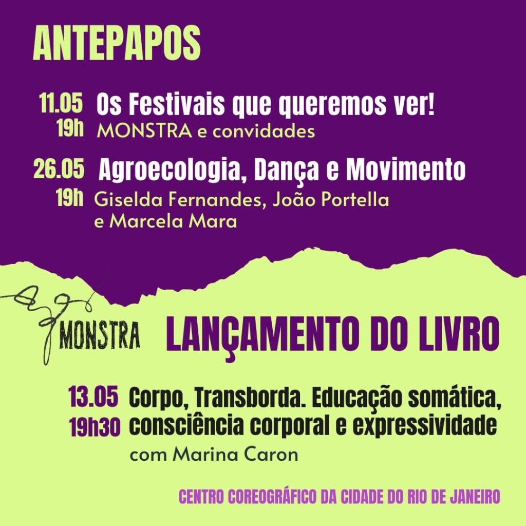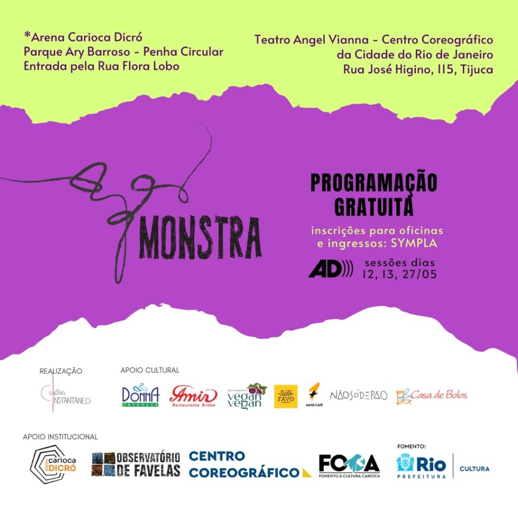 A MONSTRA é uma mostra de artes integradas com foco na linguagem da dança. Em sua sexta edição, a mostra conta com oficinas para públicos diversos, espetáculo de dança, mesa de debate e lançamento de livro. Confira toda a programação no instagram @a.mostra.monsta