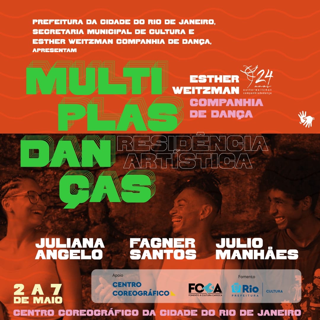 A Residência artística Múltiplas Danças se concretiza através do interesse da Esther Weitzman Cia de Dança em fomentar um espaço intensivo de troca de saberes, danças, experiências e afetos. Com 6 dias consecutivos de duração, a residência será ministrada por Fagner Santos, Juliana Angelo e Julio Manhães, bailarinos da Cia. O trabalho propõe uma imersão na vivência da linguagem coreográfica da companhia, através de jogos corporais e dinâmicas que fizeram parte de nossos processos criativos.