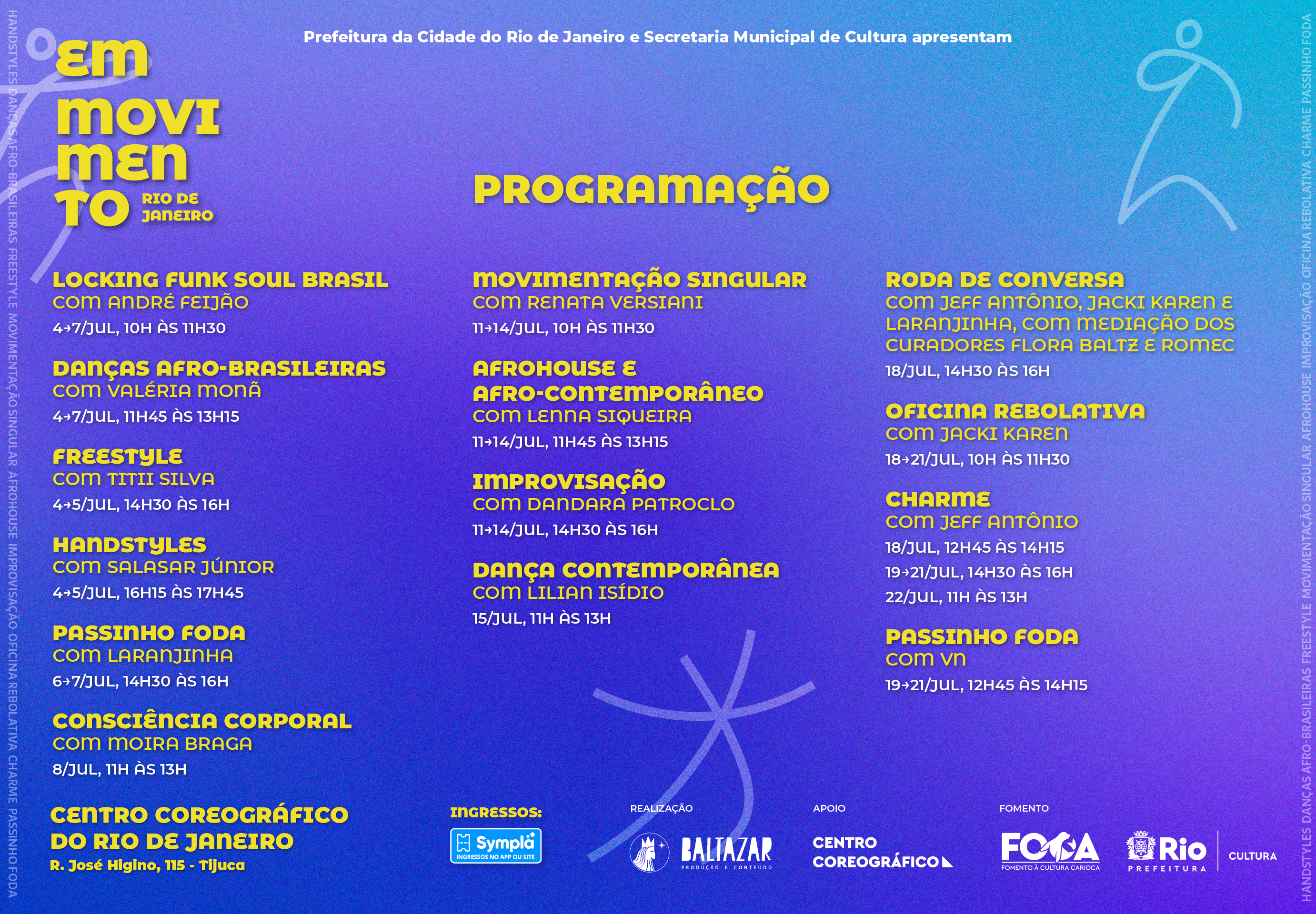 O projeto “Em Movimento” foi contemplado pelo Programa de Fomento Carioca – FOCA 2022, da prefeitura da cidade do Rio de Janeiro, através da secretaria de cultura.