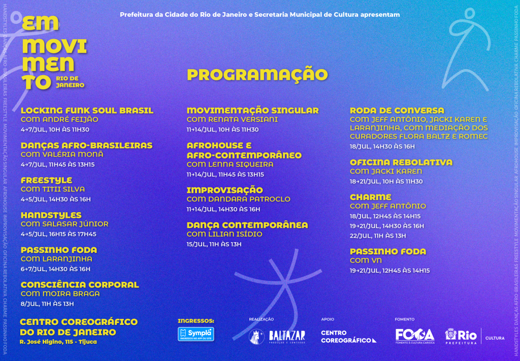 SEMANA 1 (4 a 7 de julho) – “Locking Funk Soul Brasil” com André Feijão; “Danças Afro-Brasileiras” com Valéria Monã; “Freettyle” com Titii Silva; “Passinho Foda” com Laranjinha; “Handstyles” com Salasar Júnior. E Espaço Aberto.