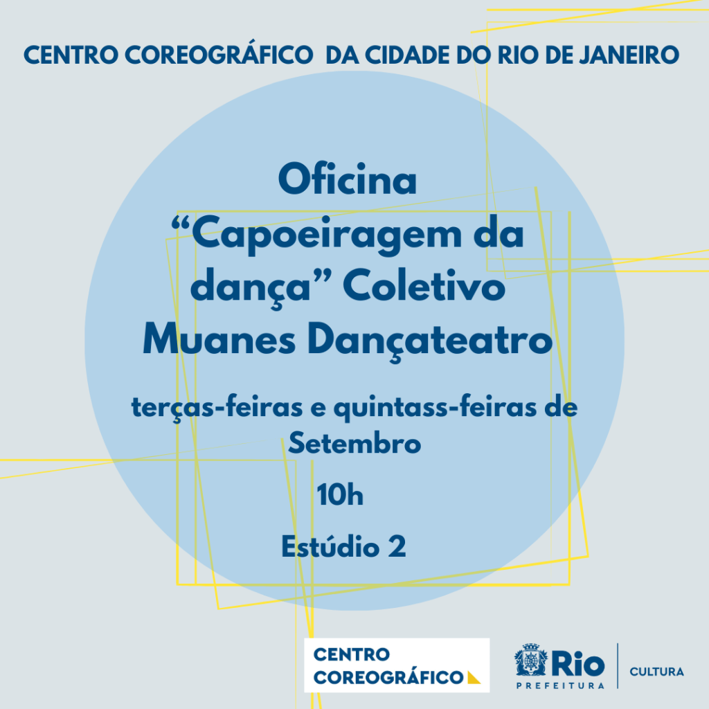 Durante o mês de Setembro o Centro Coreográfico traz duas oficinas que ocorrerão durante todo o mês. Já na próxima semana, começa a oficina “Capoeiragem da dança”, do Coletivo Muanes. Esta oficina acontece toda terça-feira e quinta-feira de Setembro. A proposta dessa atividade é “estabelecer um treinamento de Dança a partir do jogo da Capoeira; conquistar novos adeptos para esta modalidade cultural do nosso país e ainda propor agregar outras danças como o maculelê, diversas danças de bastão e Samba de Roda”.