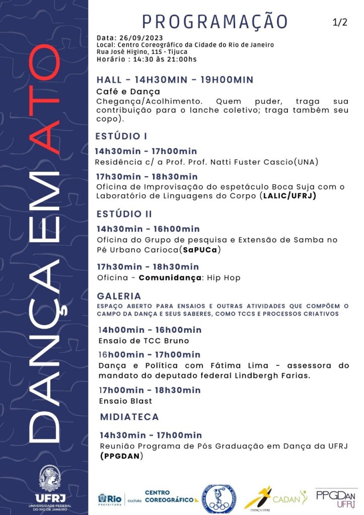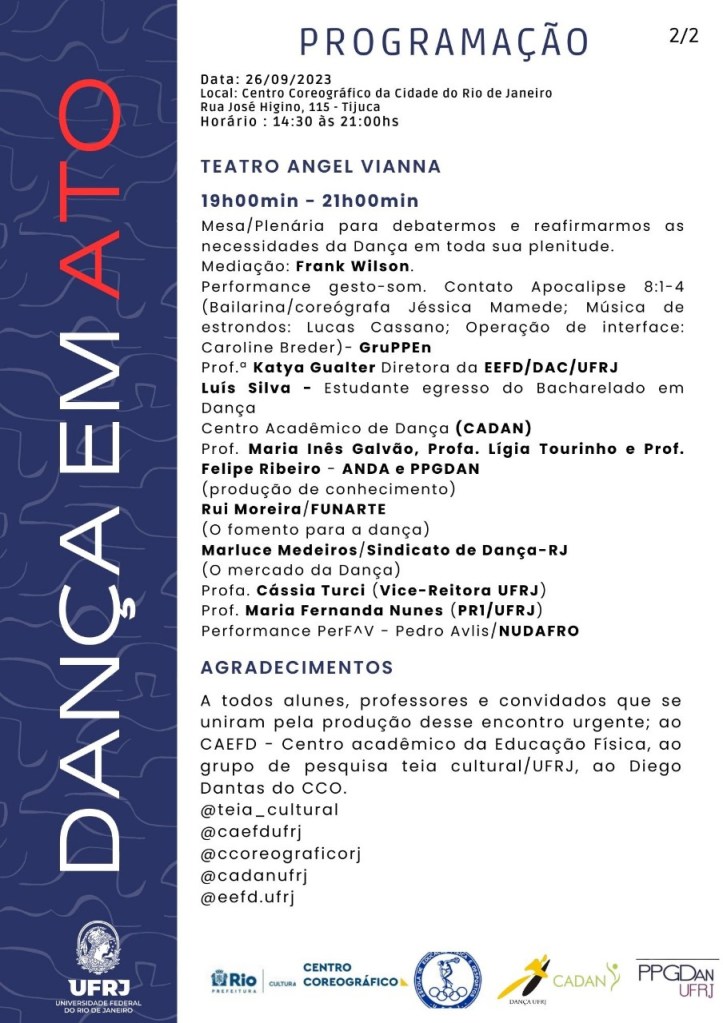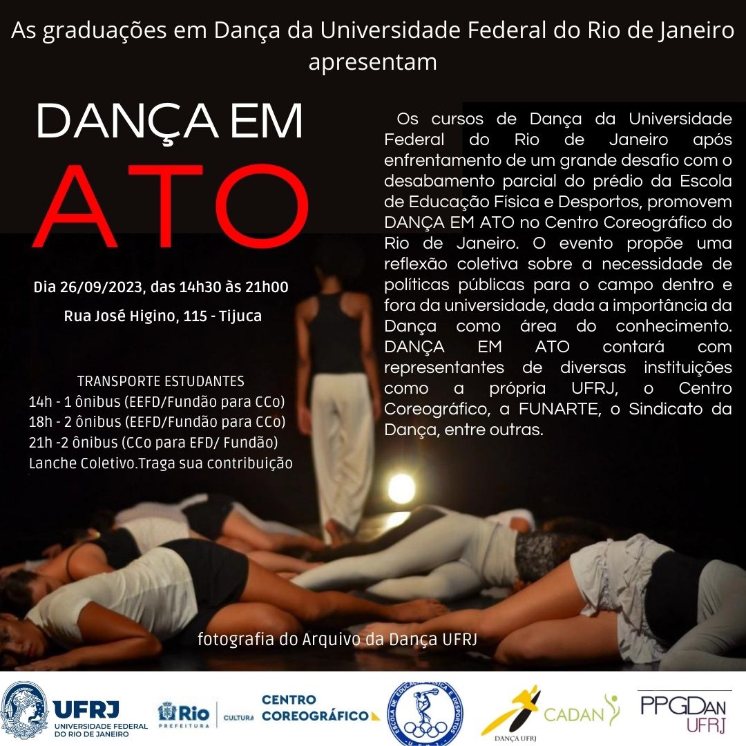 Sendo assim, os cursos de graduação da UFRJ estarão promovendo DANÇA EM ATO, evento a ser realizado no dia 26/10/2023, terça-feira, no Centro Coreográfico da Cidade do Rio de Janeiro, no intuito de promover uma reflexão coletiva sobre a necessidade de políticas públicas para o campo dentro e fora da universidade, dada a importância da Dança como área do conhecimento.