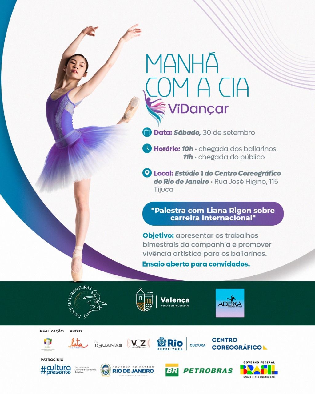 Resumo: Ensaio aberto para convidados que objetiva apresentar os trabalhos bimestrais da companhia e promover vivência artística para os bailarinos. Após o ensaio haverá um bate-papo com Liana Rigon sobre o programa de intercâmbio para professores de dança da Associação ADEIXA em Portugal.