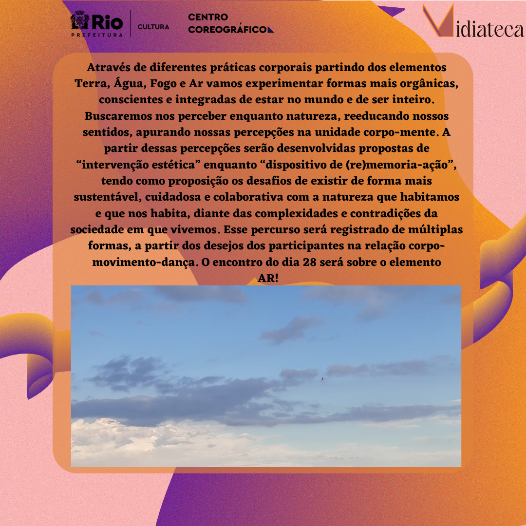 Histórico do Projeto: As Oficinas Plurais propostas pela Midiateca do Centro Coreográfico surgiram em Abril deste ano como forma de suscitar através da(s) Dança(s) em diálogo com diferentes temáticas, possíveis reflexões, ações e movimentos em relação a questões urgentes na atualidade. Começamos com a temática do “Feminino”, que foi abordada por diferentes olhares através de artistas-residentes convidadas do CCo. A experiência de 4 meses (de abril a julho) das Rodas Femininas culminou na criação de um work in progress com roda de conversa que refletiu um pouco do percurso desenvolvido. Nessa nova etapa pretendemos desdobrar e aprofundar esta intensa e fértil experiência, através do mergulho na Natureza e seus quatro Elementos para começarmos a mover o tema da “Sustentabilidade” em múltiplas perspectivas.