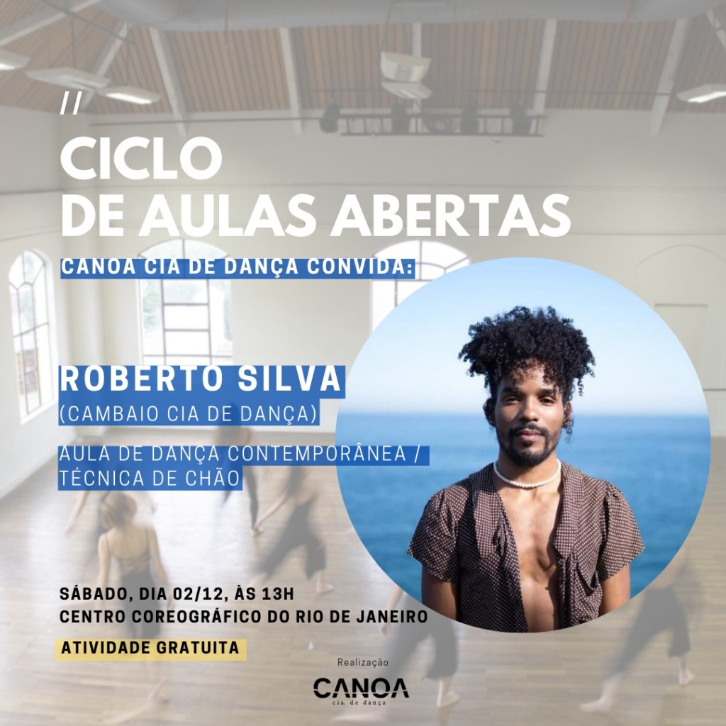 Resumo: Canoa Cia de Dança convida Roberto Silva – bailarino, coreógrafo e diretor da Cambaio Cia de Dança. Roberto ministrará aula de dança contemporânea / técnica de chão. Essa é a primeira edição do projeto “Ciclo de aulas abertas da Canoa Cia de Dança”, que visa abrir as portas dos ensaios da companhia para bailarinos de fora, criando um ambiente de intercâmbio de conhecimento e estudo coletivo. Pretende-se convidar profissionais e parceiros da Canoa para ministrarem aulas e oficinas abertas ao público externo, potencializando a companhia também como uma plataforma de formação artística.