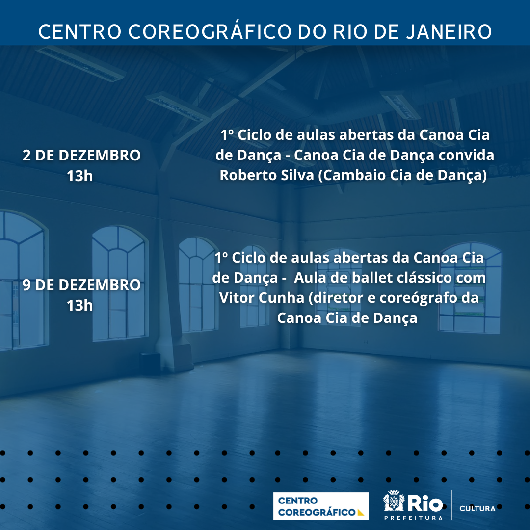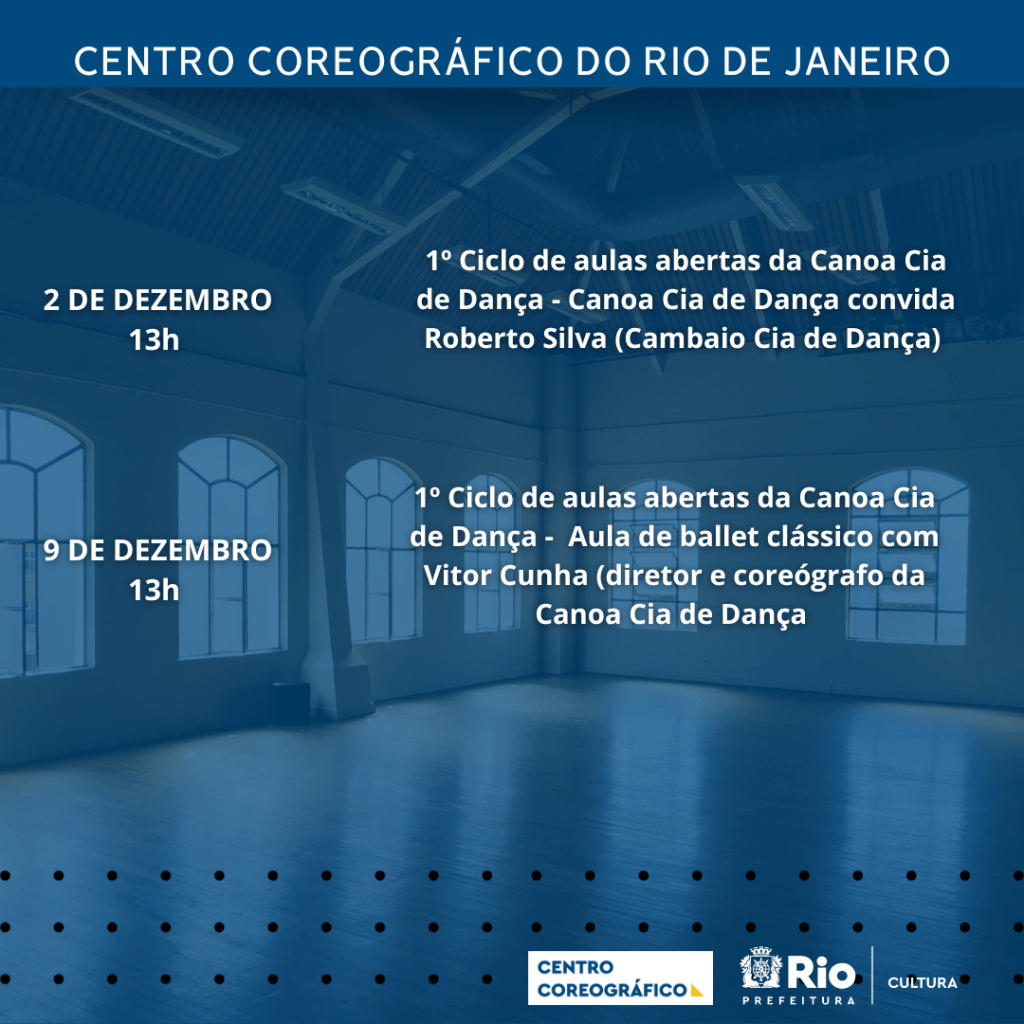 Resumo: Aula de ballet clássico ministrada por Vitor Cunha – bailarino, coreógrafo e diretor da Canoa Cia de Dança. A aula terá nível intermediário e é destinada a estudantes e profissionais de ballet clássico e dança contemporânea. Essa é a primeira edição do projeto “Ciclo de aulas abertas da Canoa Cia de Dança”, que visa abrir as portas dos ensaios da companhia para bailarinos de fora, criando um ambiente de intercâmbio de conhecimento e estudo coletivo. Pretende-se convidar profissionais e parceiros da Canoa para ministrarem aulas e oficinas abertas ao público externo, potencializando a companhia também como uma plataforma de formação artística.