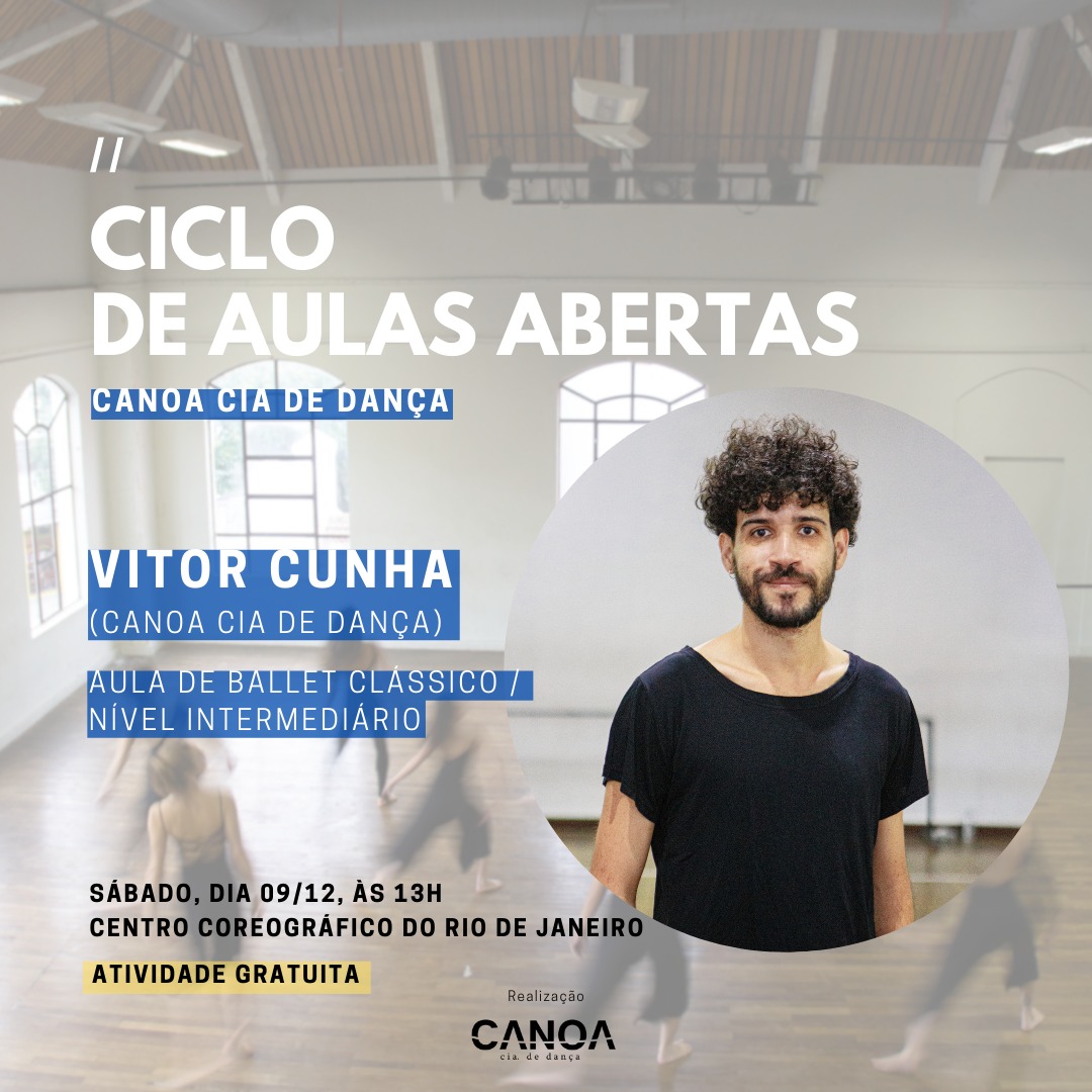 Resumo: Aula de ballet clássico ministrada por Vitor Cunha – bailarino, coreógrafo e diretor da Canoa Cia de Dança. A aula terá nível intermediário e é destinada a estudantes e profissionais de ballet clássico e dança contemporânea. Essa é a primeira edição do projeto “Ciclo de aulas abertas da Canoa Cia de Dança”, que visa abrir as portas dos ensaios da companhia para bailarinos de fora, criando um ambiente de intercâmbio de conhecimento e estudo coletivo. Pretende-se convidar profissionais e parceiros da Canoa para ministrarem aulas e oficinas abertas ao público externo, potencializando a companhia também como uma plataforma de formação artística.